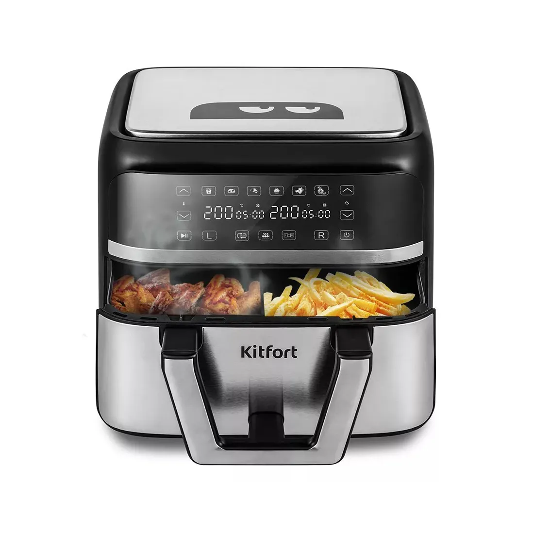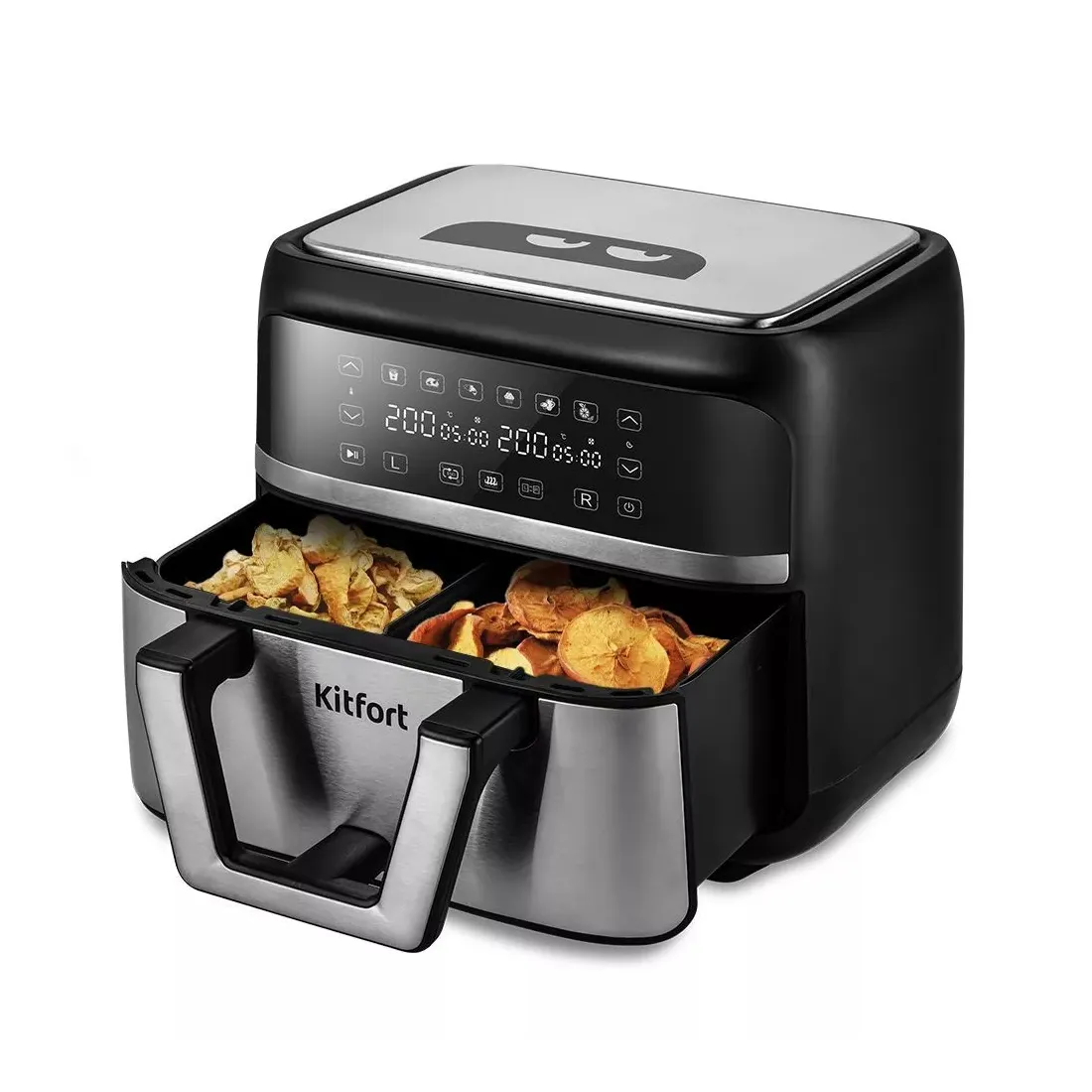 Современный аэрогриль КТ-2247 с 2 раздельными нагревателями интересен стильным дизайном, а также позволяет готовить большинство продуктов без добавления масла, а также может использоваться как сушилка для фруктов и овощей.