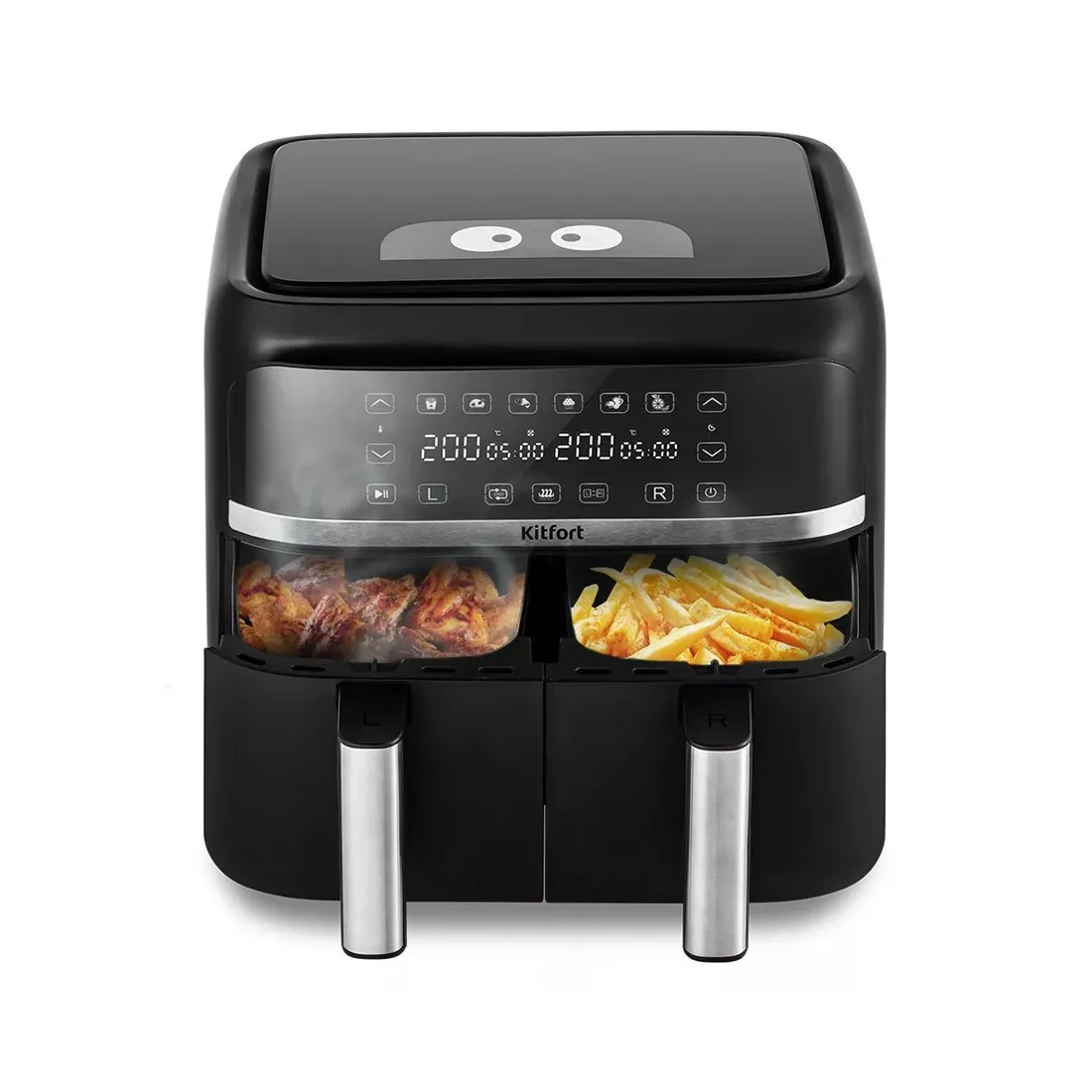 Аэрогриль оснащён сенсорным управлением, имеет 6 программ, синхронизацию приготовления и подогрев. Можно установить таймер до 60 мин и t° до 200°C для каждого нагревателя. На дисплее отображаются заданные параметры и какие нагреватели работают.