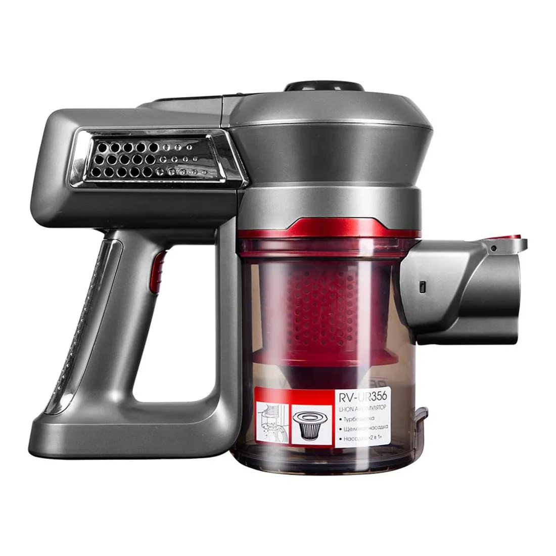 RV-UR356 легкий эргономичный, он сделает ежедневную рутинную уборку максимально комфортной. Вам не нужно собирать устройство, разматывать шнур и включать прибор в розетку, чтобы убрать мусор или пыль. Пылесос всегда готов к работе, с его помощью вы в считанные минуты уберете рассыпанную крупу или песок от уличной обуви в прихожей.