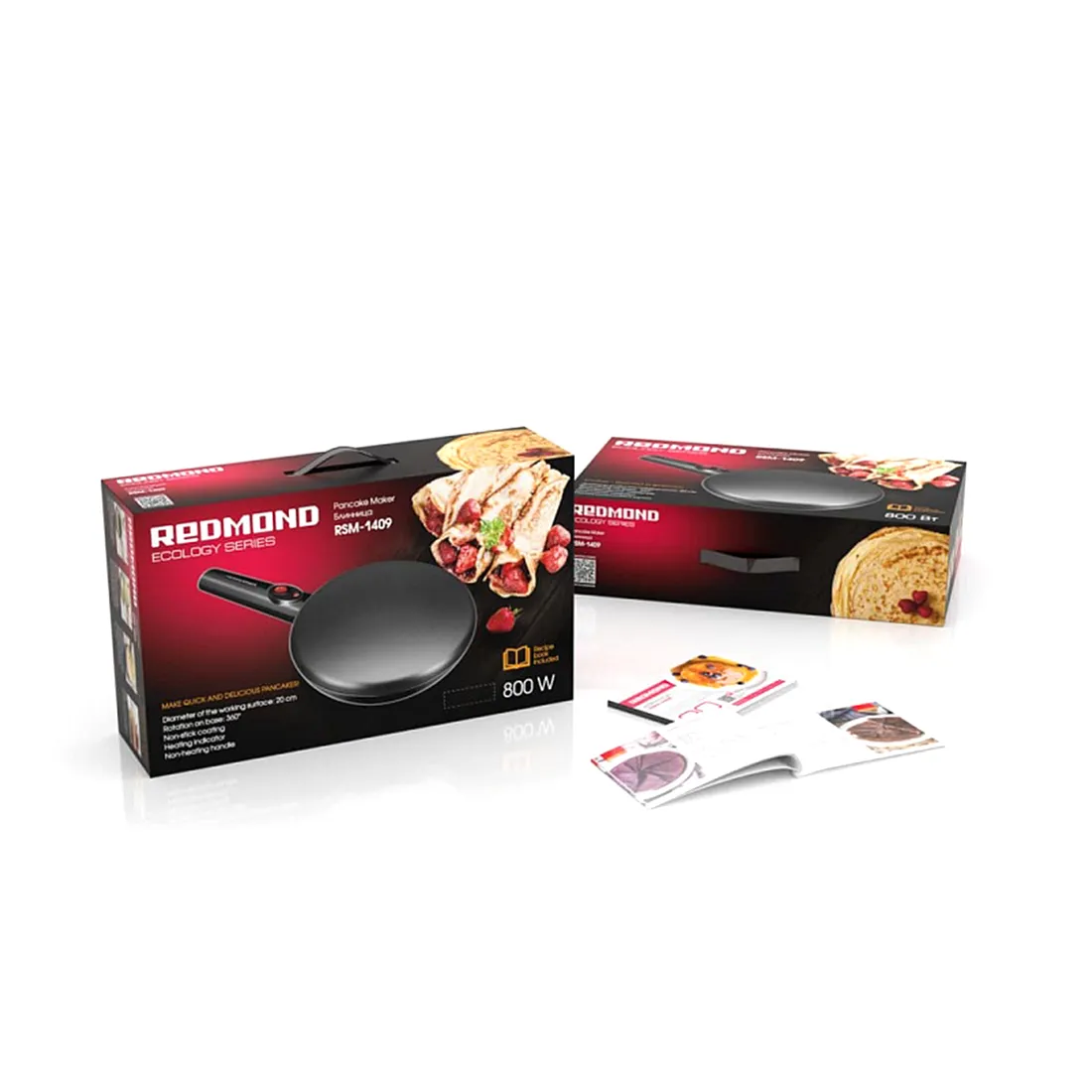 В комплекте к блиннице прилагается книга с 20 рецептами на любой вкус: от диетических творожных блинов до оригинальных блинчиков на кокосовом молоке. Каждый рецепт составлен и проверен поварами REDMOND и идеально подходит для RSM-1409.
