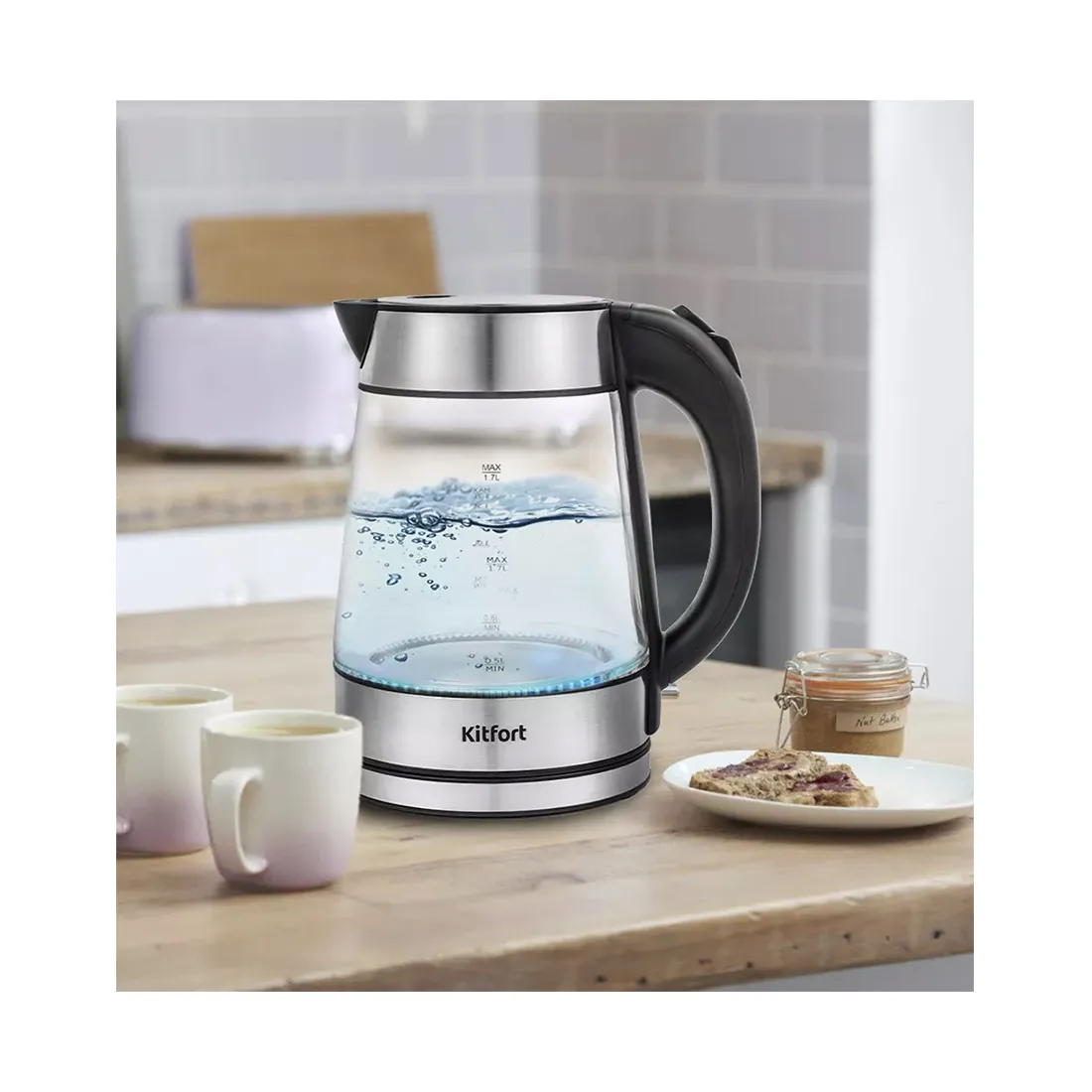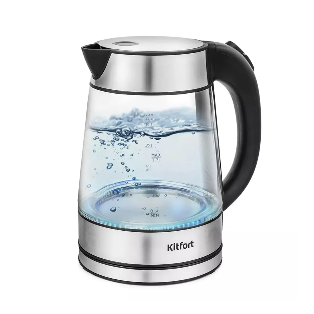 Чайник электрический, Kitfort, КТ-6105, Мощность 2200 Вт, Ёмкость 1.7л, Режим нагрева 100 °С, Стеклянная колба, Длина шнура 0.65м, Блокировка включения без воды, Цветовая индикация температурного режима, Стальной