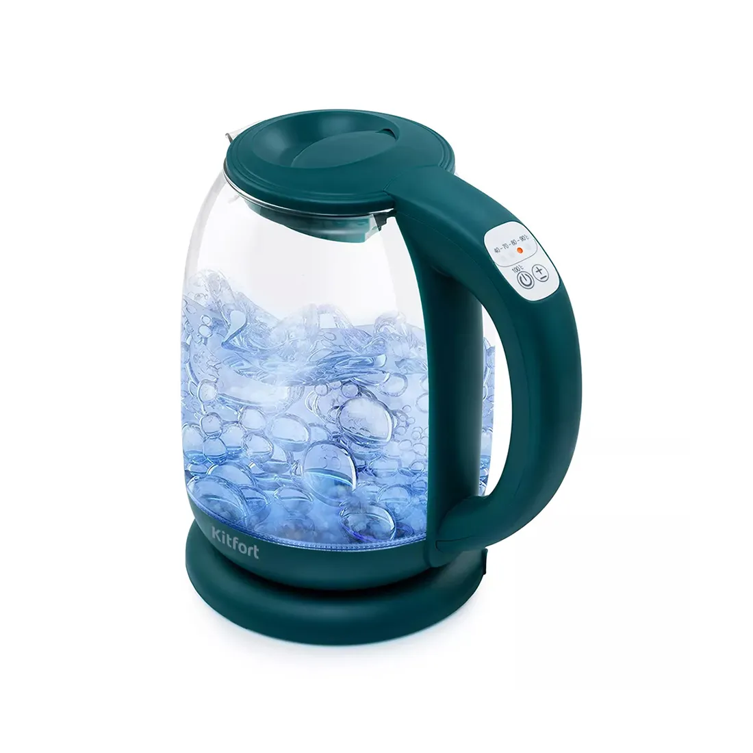 Чайник электрический, Kitfort, КТ-640-4, Мощность 2200 Вт, Ёмкость 1.7л, Режимы нагрева 40-100 °С, Стекло, Длина шнура 0.64м, Автоотключение, Цветовая индикация, Изумрудный