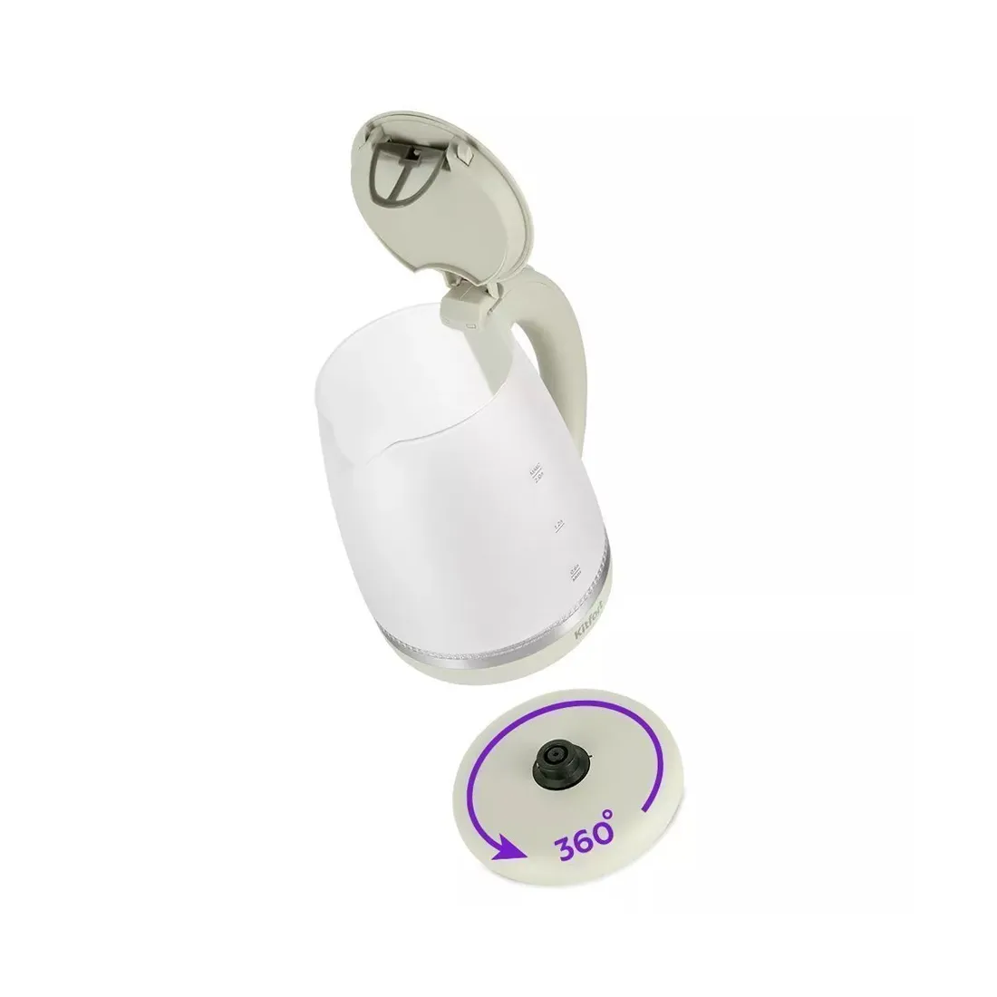 При включении чайника загорается подсветка, которая является индикатором работы и одновременно художественно подсвечивает кипящую воду. Подставка с центральным контактом позволяет располагать на ней чайник в любом положении, обеспечивая вращение на 360°.