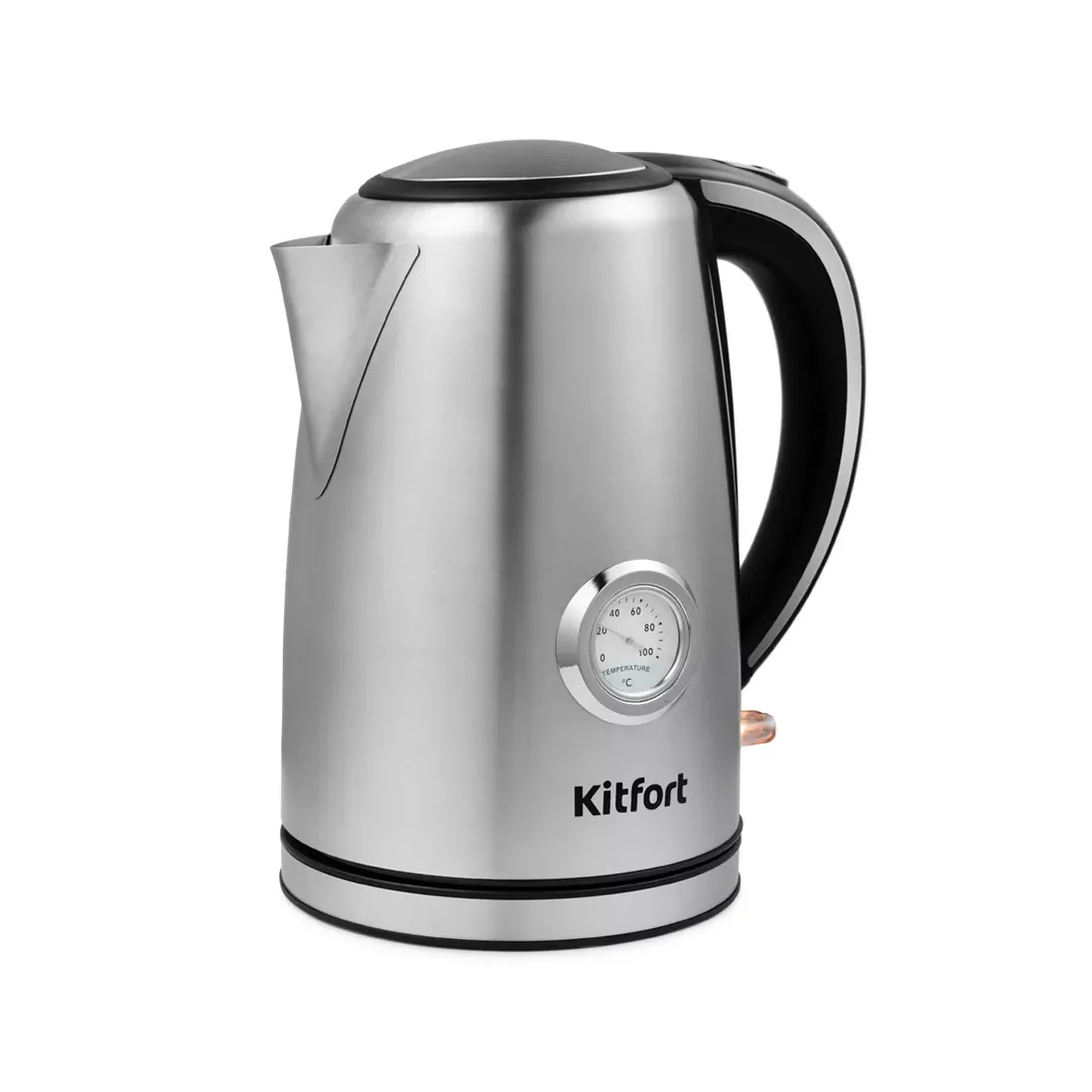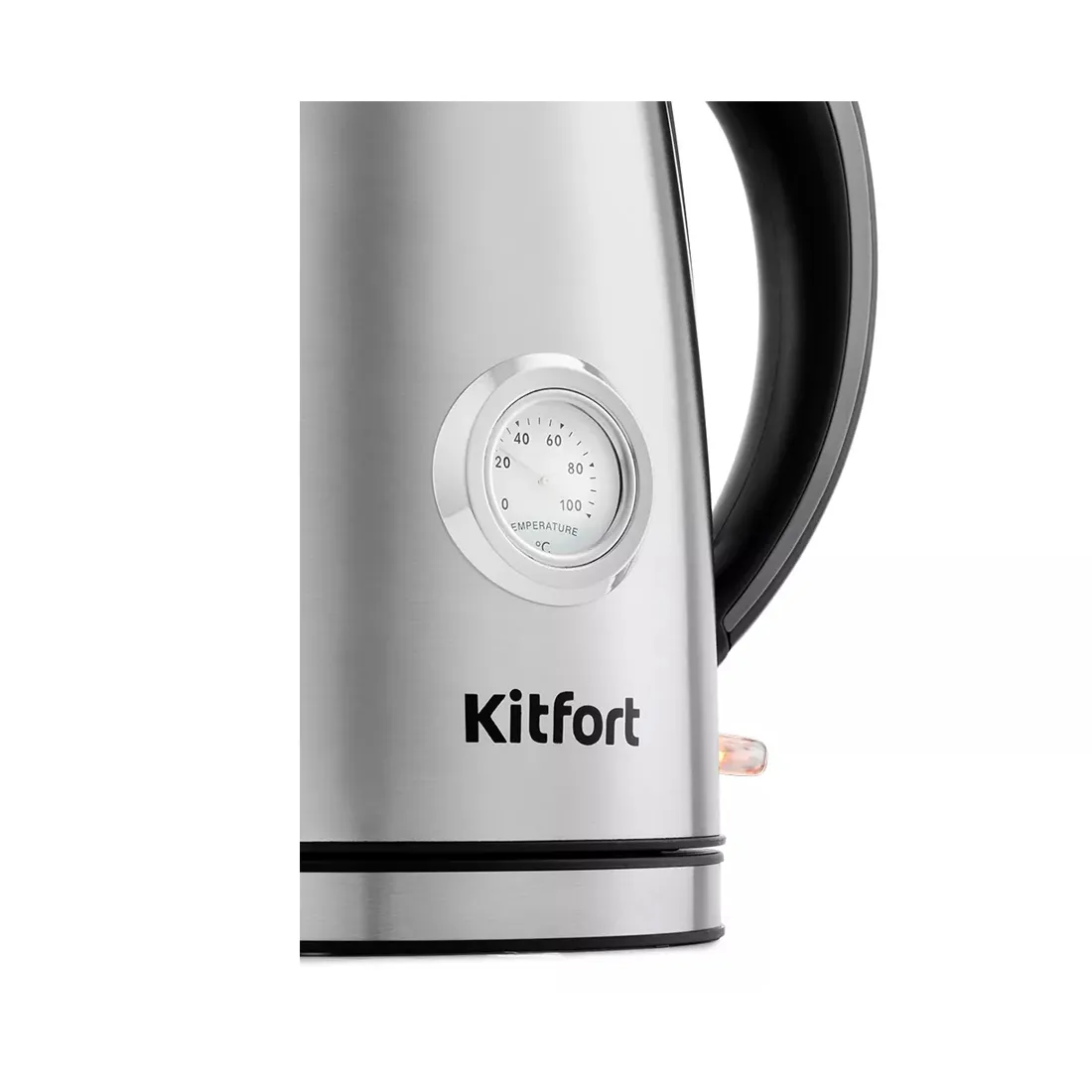 На корпусе чайника Kitfort KT-676 расположен термометр, который показывает температуру воды. Это удобно, если вы готовите напитки, для которых требуются определенная температура воды, например, зеленый чай, белый чай, кофе и т. д.