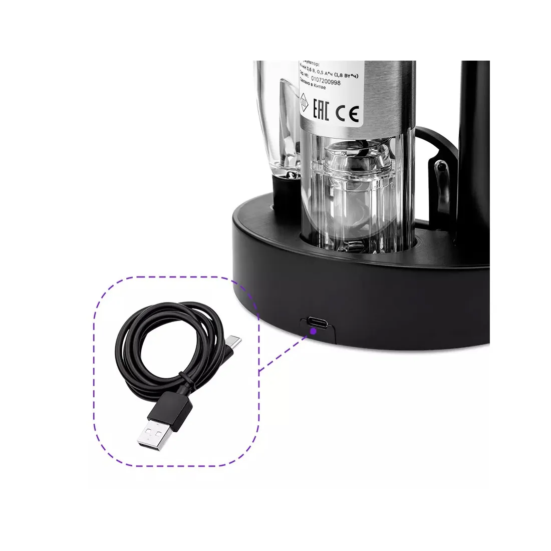 Устройство питается от встроенного аккумулятора. Штопор заряжается при установке на базу для зарядки. В комплекте идёт шнур USB Type-C. Обычное время зарядки составляет около 10 часов. Этого хватает на 30 циклов работы.
