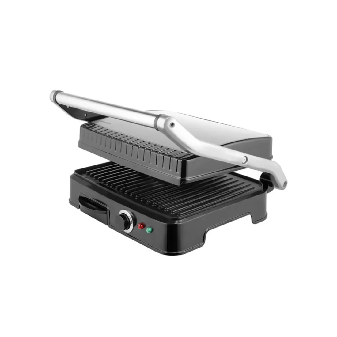 Антипригарное покрытие рабочих панелей и поддон для сбора масла не дает продуктам пригореть и упрощает мытье после готовки. На корпусе расположены 2 LED-индикатора (питания и нагрева) и поворотный переключатель температуры.