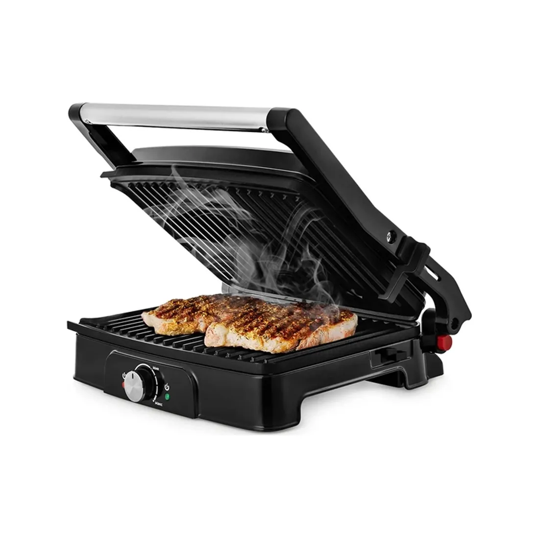 Регулятор t позволяет плавно регулировать t приготовления от мин – 100-140°С, до макс – 180-220°С. Индикатор нагрева горит в то время, когда включен нагревательный элемент. Индикатор питания загорается при подключении гриля к сети и гаснет при отключении.