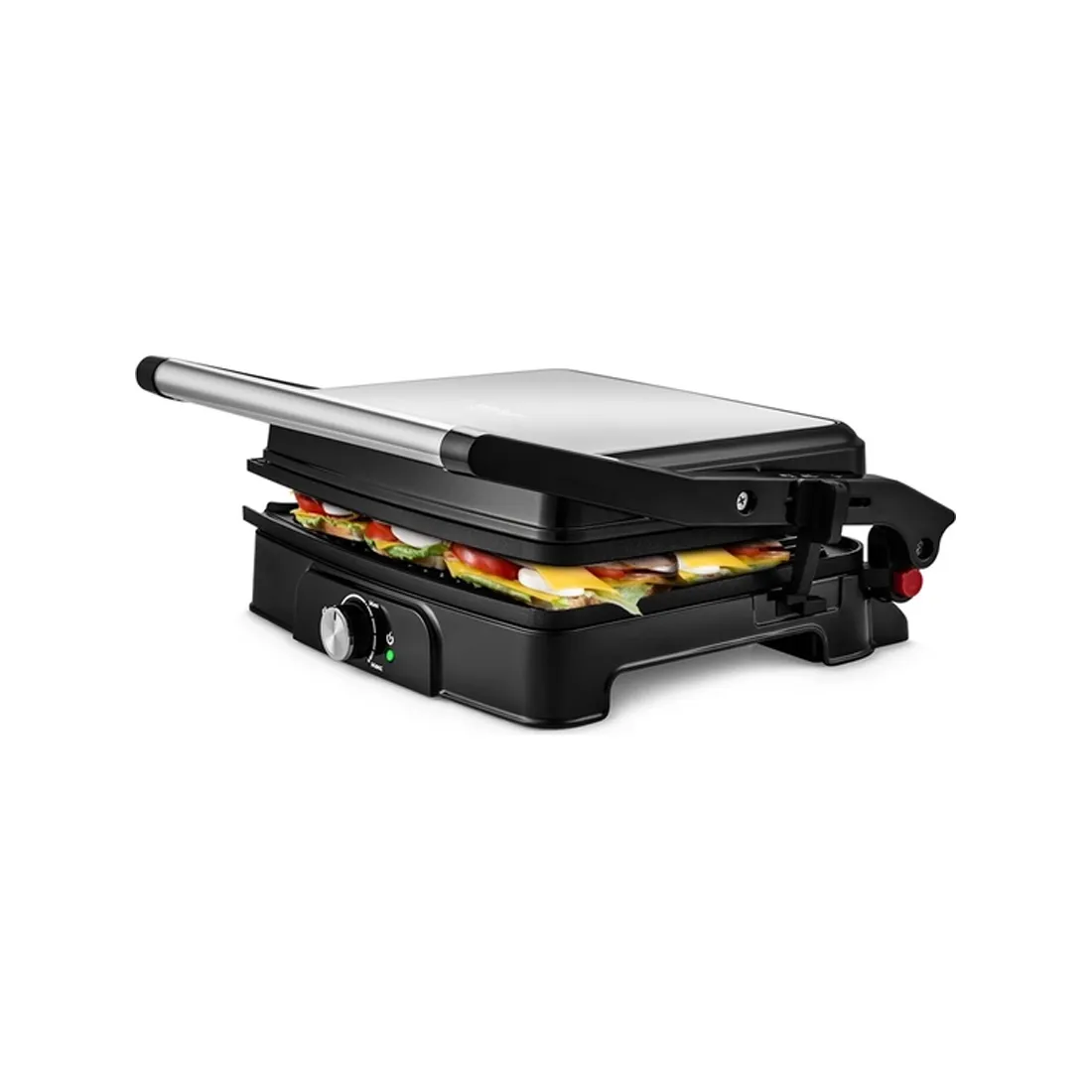 В одностороннем режиме крышка гриля откидывается на 180°, благодаря чему гриль превращается в большую жаровню, а продукты можно выложить сразу на две панели. Для раскладывания гриля предусмотрена специальная кнопка на боковой части корпуса.