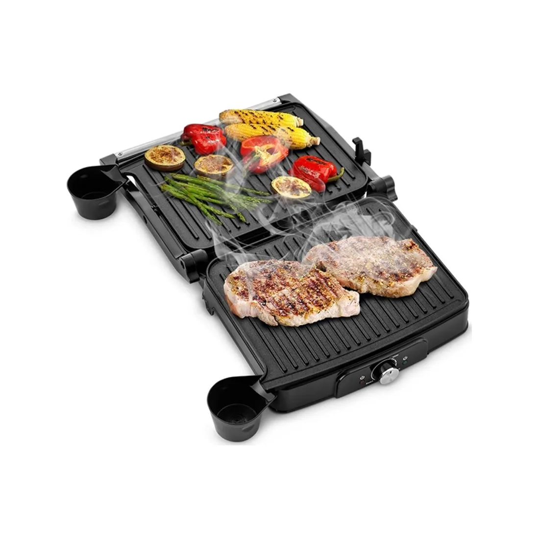 Для сбора жира, сока и лишнего маринада предназначены специальные бороздки на нижней и верхней панелях гриля – во время приготовления жир скапливается в них, а затем стекает в съёмные ёмкости для жидкости.