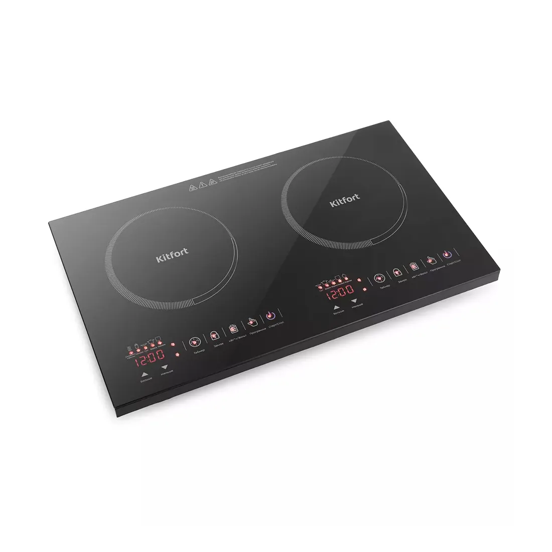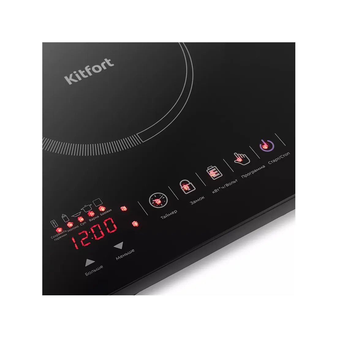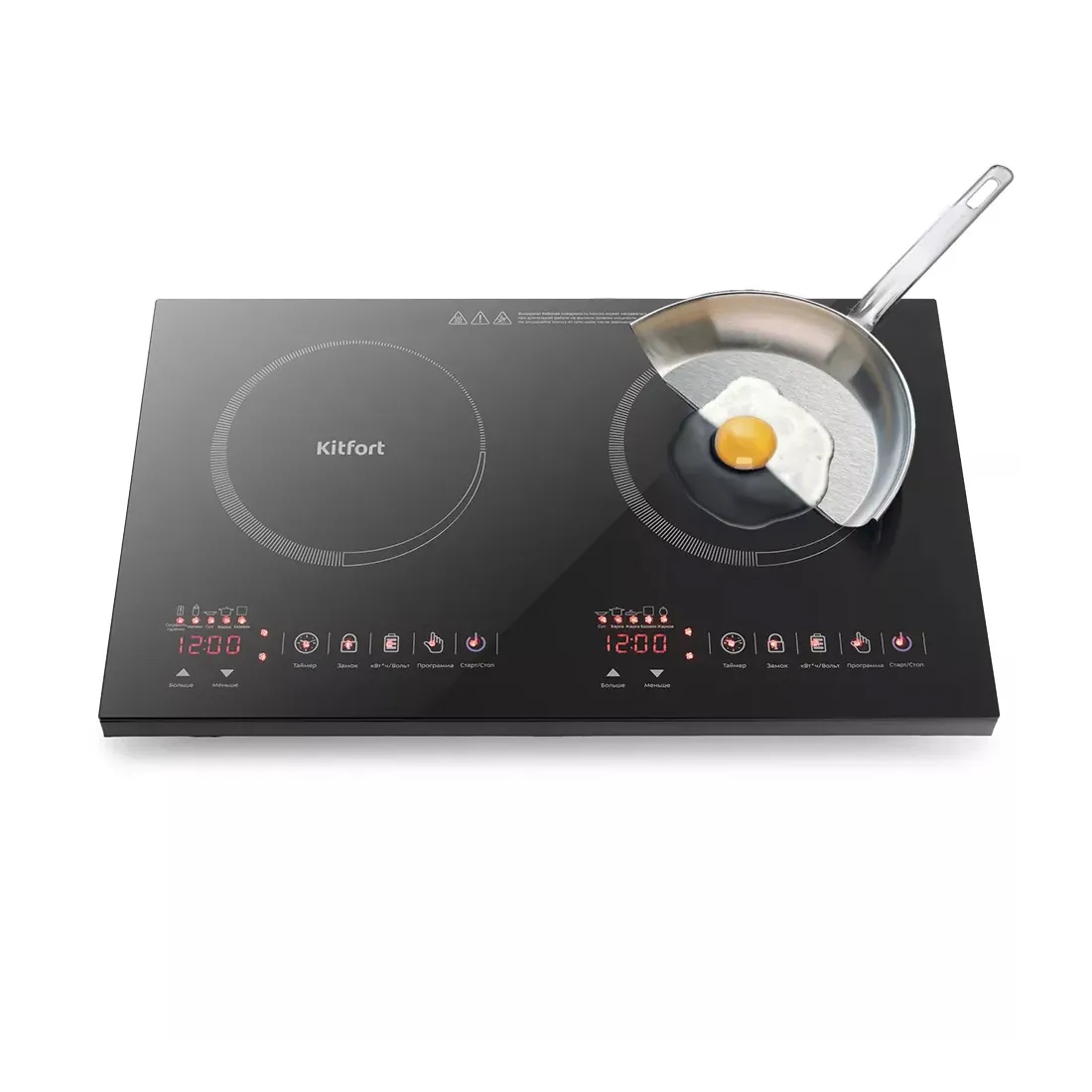 Индукционная плитка, Kitfort, КТ-105, 2 конфорки, 7 автоматических программ, Сенсорное управление, Стеклокерамика, Диаметр дна посуды 12-26 см, Таймер 24ч, Мощность 2000 Вт, Черный