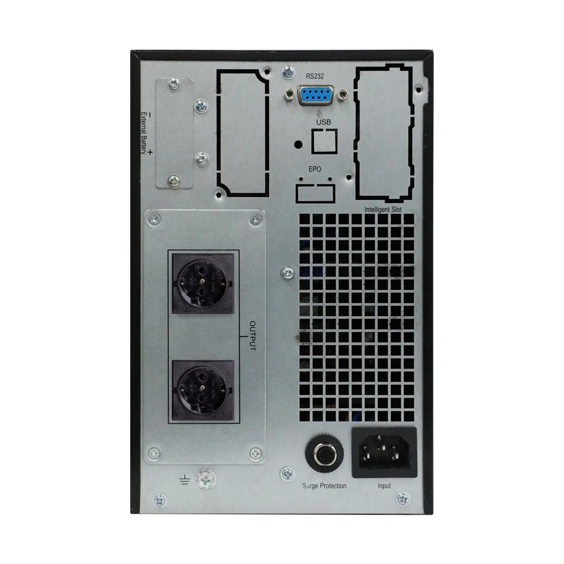 Используется для защиты питания файловых серверов и АТС, а также любого другого оборудования, предъявляющего повышенные требования к качеству сетевого электропитания. Принцип работы состоит в двойном преобразовании (double conversion) тока. Сначала входное переменное напряжение преобразуется в постоянное, затем обратно в переменное напряжение с помощью обратного преобразователя (инвертора). При потере питания в городской сети, время переключения в автономный режим равно нулю. ИБП с внешним подключением батарейного блока, позволяет индивидуально конфигурировать время автономной работы. ИБП оснащен интерфейсными портами USB/RS-232, благодаря которым можно наблюдать за параметрами работы ИБП.