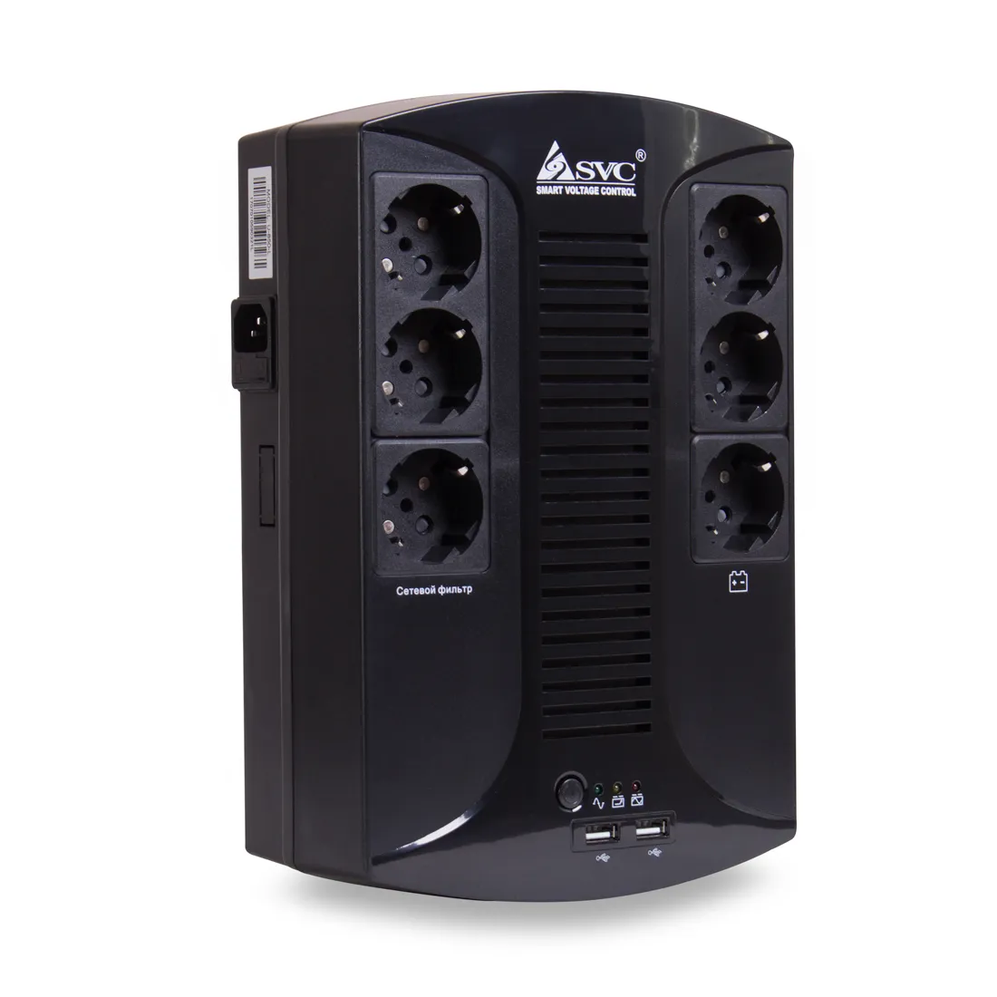 Источник бесперебойного питания, SVC, U-850-L, USB, Мощность 850ВА/510Вт, Диапазон работы AVR: 145-290В, Бат.: 12В/8Ач., 6 вых.: Shuko CEE7(3 с работой от батареи, 3 сетевой фильтр), USB 5В/2А*2 шт., Чёрный