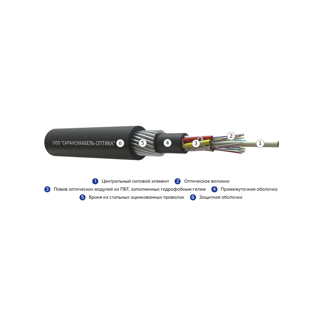 Кабель содержит сердечник модульной конструкции с центральным силовым элементом из стеклопластикового прутка, вокруг которого скручены оптические модули методом правильной SZ-скрутки. Внутри оптических модулей свободно уложены оптические волокна. Свободное пространство внутри оптических модулей и межмодульное пространство заполнено гидрофобным заполнителем. Сердечник скреплен нитями. На сердечниках наложена ПЭТ-лента, закрепленная нитью. Поверх сердечника накладывается промежуточная оболочка из полиэтилена.Поверх оболочки накладывается броня из стальных оцинкованных проволок. Свободное пространство между промежуточной оболочкой и элементами бронепокрова заполняется гидрофобным заполнителем. Поверх проволочной брони накладывается защитная оболочка из полиэтилена высокой плотности.