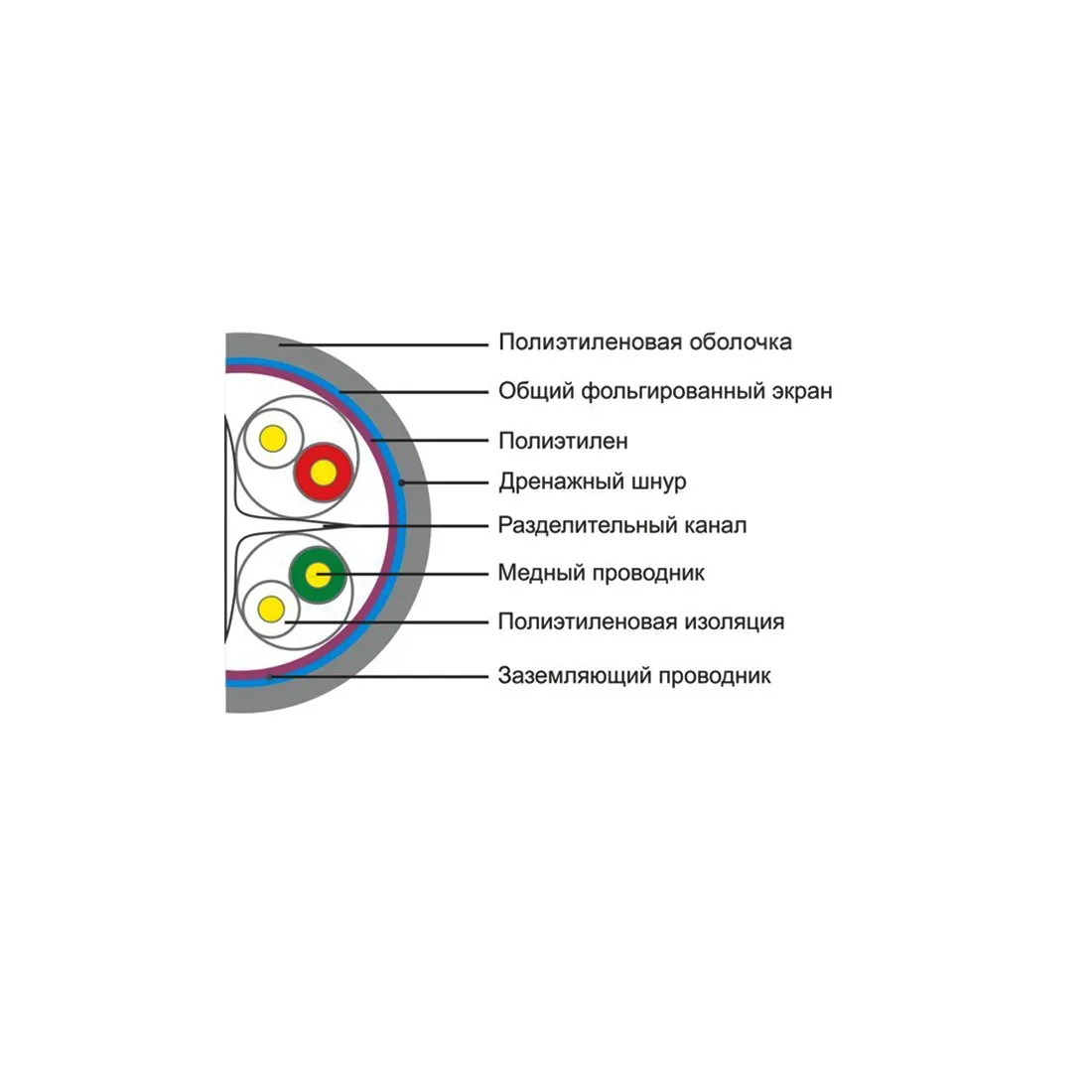 Это экранированный (FTP) 4 — х парный кабель 6 категории. Защищён одним общим экраном в виде фольги. Экран снижает уровень электромагнитного излучения кабеля и повышает защищённость от внешних помех. Используется при значительном уровне внешних наводок (производственные помещения) или при повышенных требованиях к информационной безопасности. В отличии от кабеля 5e категории имеет жилу 0,574 мм., что позволяет работать на частоте 250 Мгц. В центре кабеля проходит разделительный канал, препятствующий переплетению пар между собой. Также по стандарту 6 категории, каждая пара имеет свой шаг скрутки. Кабель имеет стандартную PE оболочку, применяется при прокладке вне помещений.