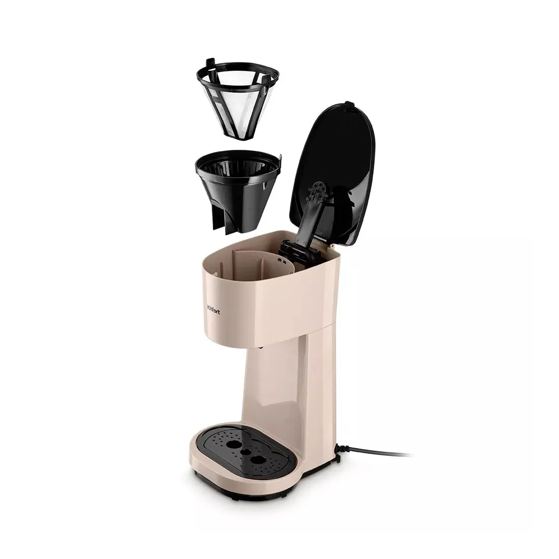 Кофеварка капельная, Kitfort, КТ-7303, Мощность 800 Вт, Тип нагревателя бойлер, Объем резервуара для воды 840 мл, Объем резервуара для кофе 450 мл, Материал колбы нержавеющая сталь, Используемый кофе молотый , Цвет бежевый/черный