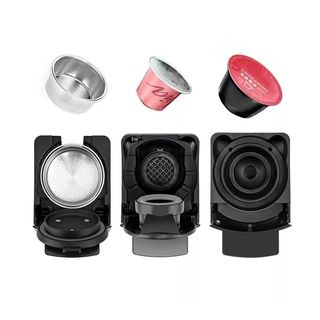Благодаря 3 адаптерам, которые входят в комплект, кофеварка подходит для капсул типа Nespresso и Dolce Gusto, а также для молотого кофе. Она прекрасно совмещает в себе все преимущества каждого типа кофеварок и готовит под давлением 19 бар.