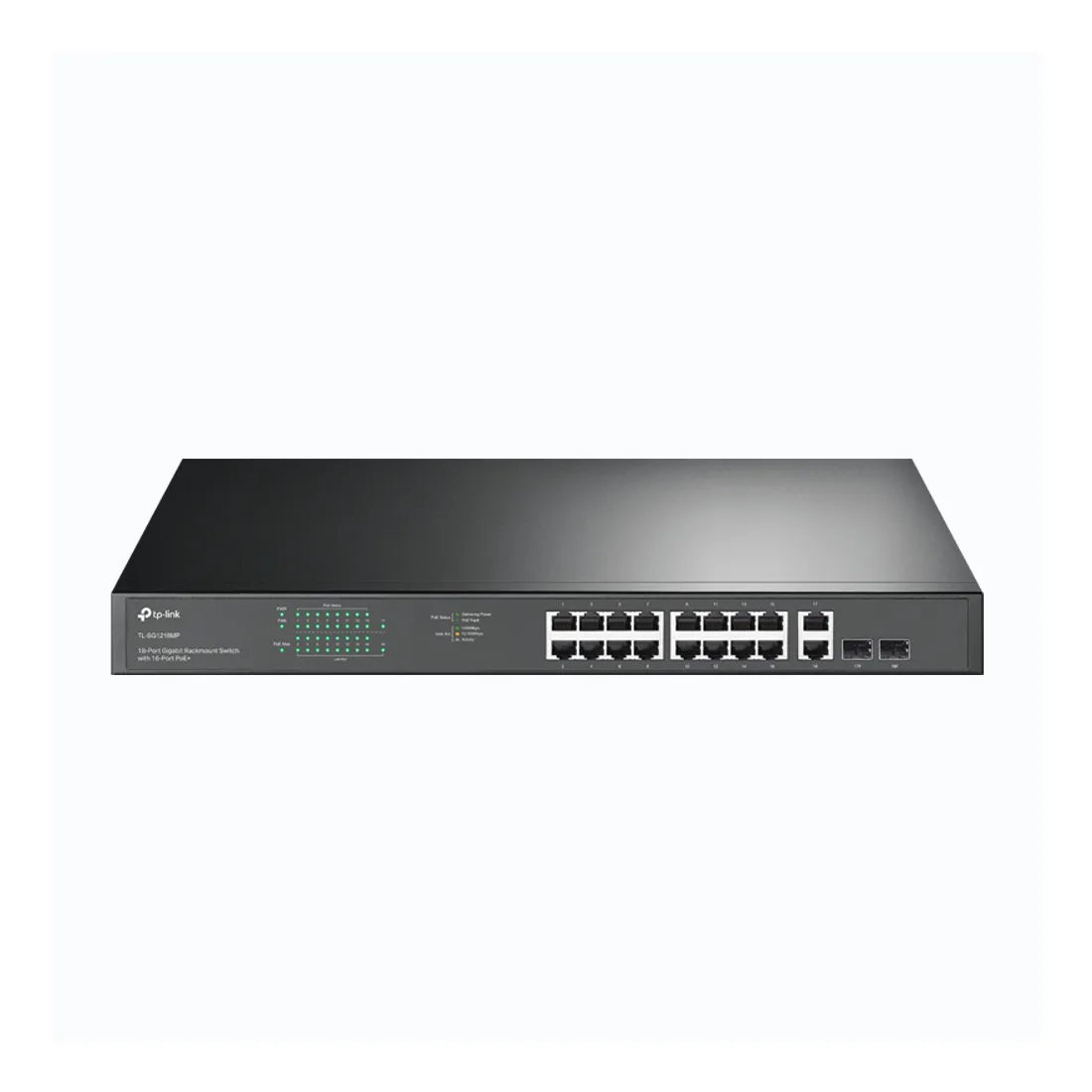 Коммутатор, TP-Link, TL-SG1218MP, Неуправляемый, 16 гигабитных PoE+ портов RJ45, 2 гигабитных порта RJ45 без PoE, 2 гигабитных комбо SFPслота,PoE 250 Вт