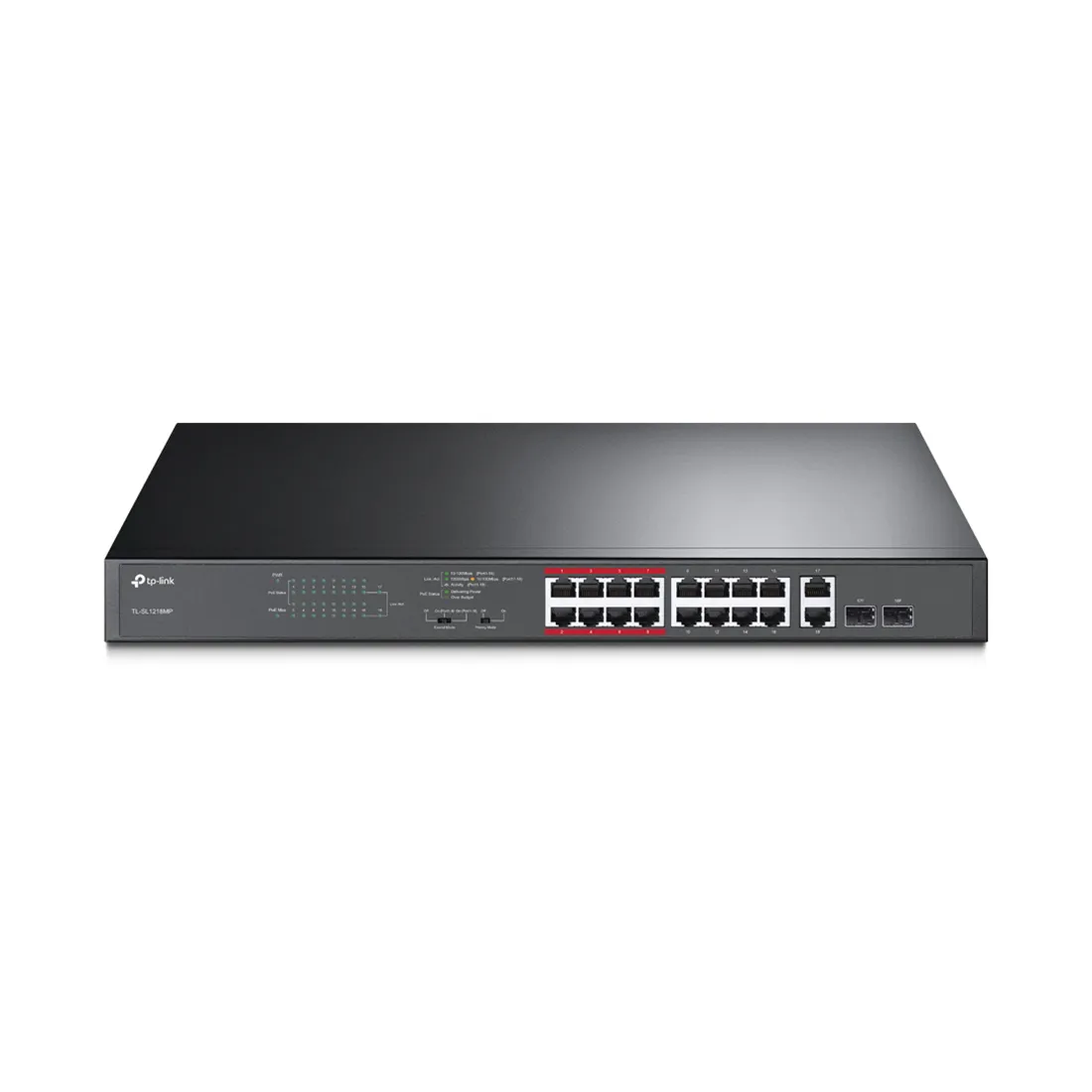 - 16 портов RJ45 10/100 Мбит/с PoE+, 2 гигабитных порта RJ45 и 2 гигабитных комбо SFP‑слота