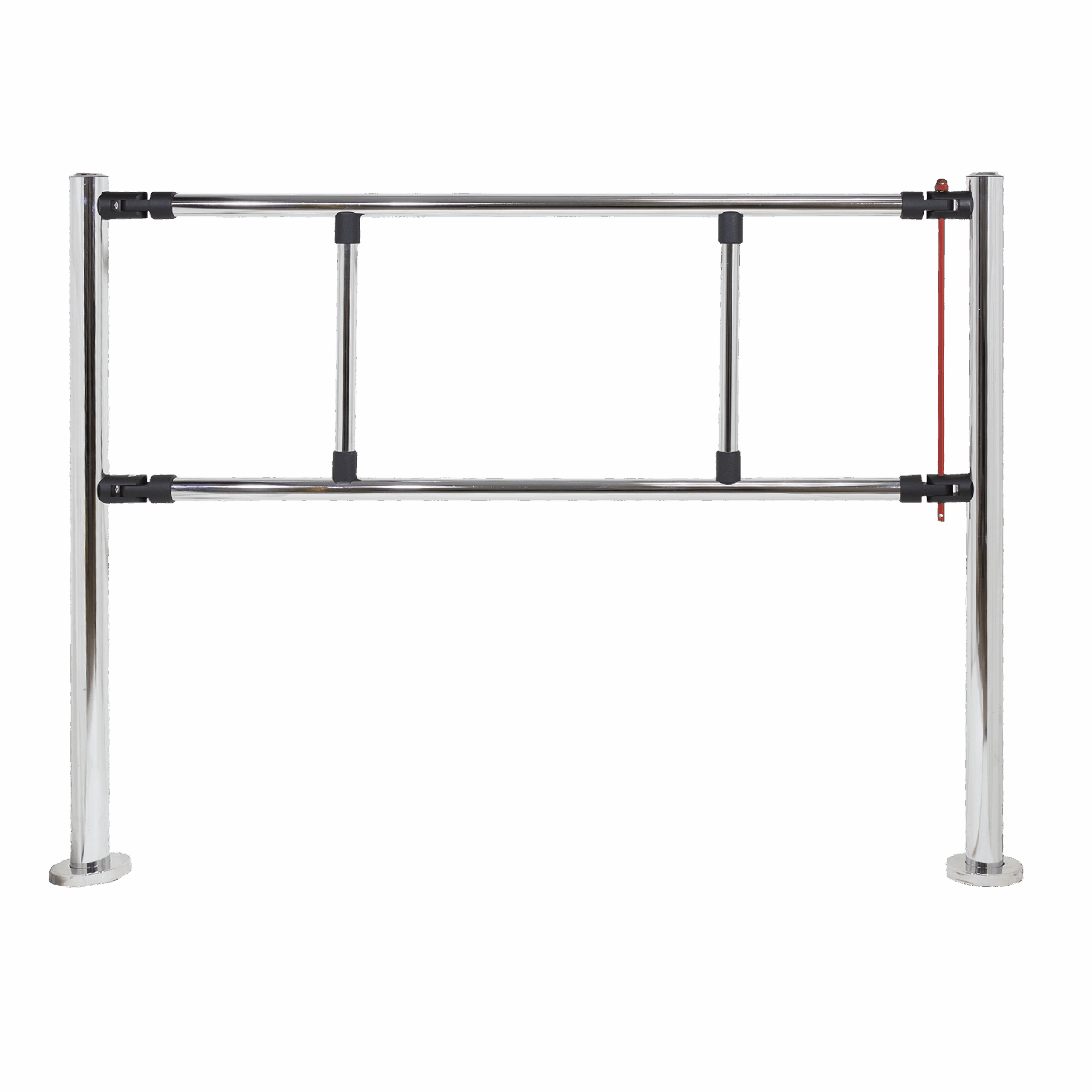 Поручни ограждения изготовлены из хромированной трубы, которые крепятся к вертикальным стойкам при помощи стальных шарниров с одной стороны и специального запирающего элемента с другой. Стальные шарниры чёрного цвета прикручиваются к вертикальным стойкам.