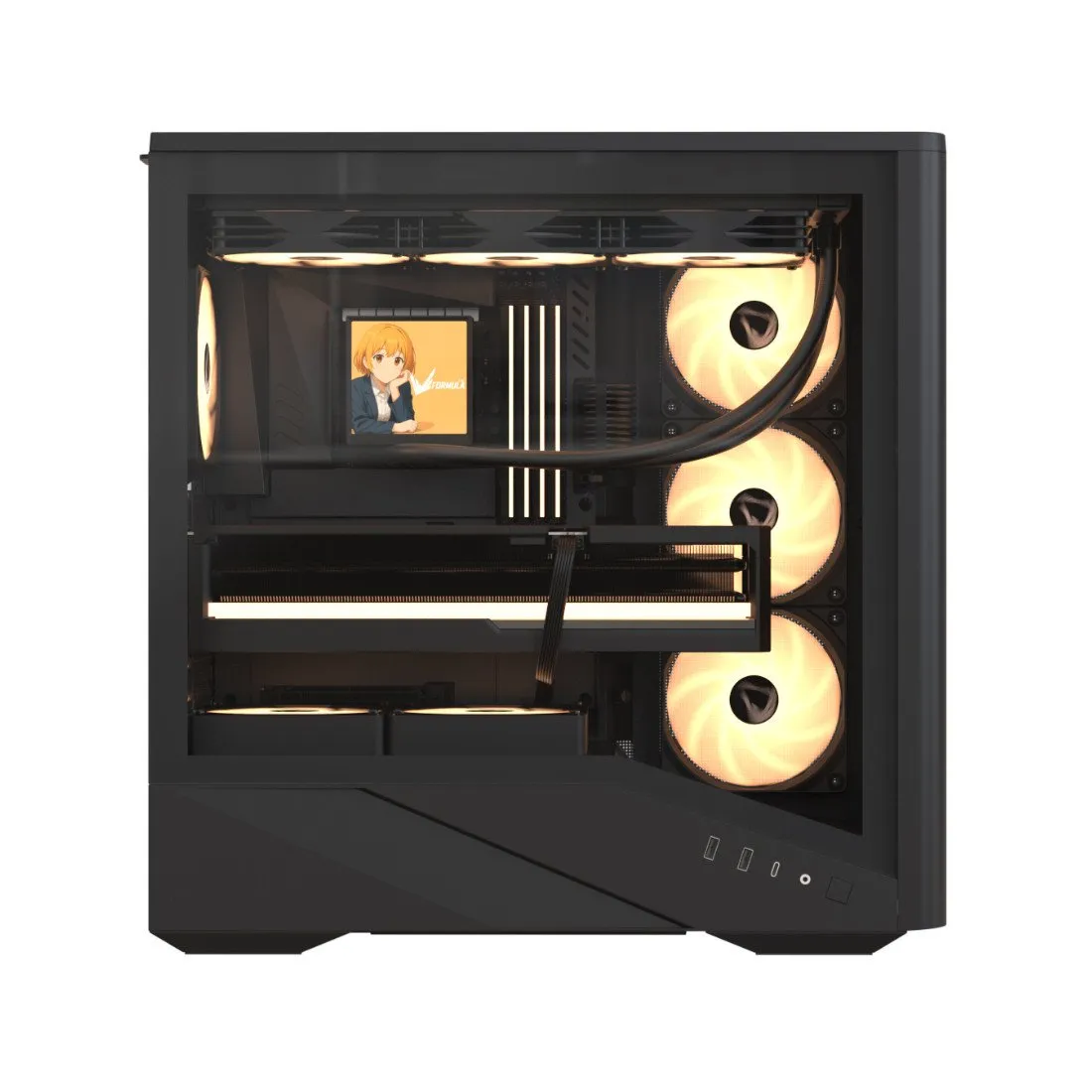 Боковая панель оснащена большой вентиляционной зоной, обеспечивающей дополнительный приток или вытяжку воздуха для боковых вентиляторов и позволяющей нижним вентиляторам забирать больше прохладного воздуха. Такое решение улучшает воздушный поток и общую эффективность охлаждения.
