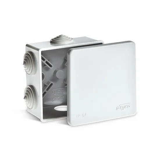 Распаячные коробки TYCO имеют уплотнитель в виде шнура, что позволяет защитить от струй воды и проникновения пыли внутрь — IP 54. Это дает возможность монтировать эти изделия в агрессивных и влажных средах внутри и вне помещений.