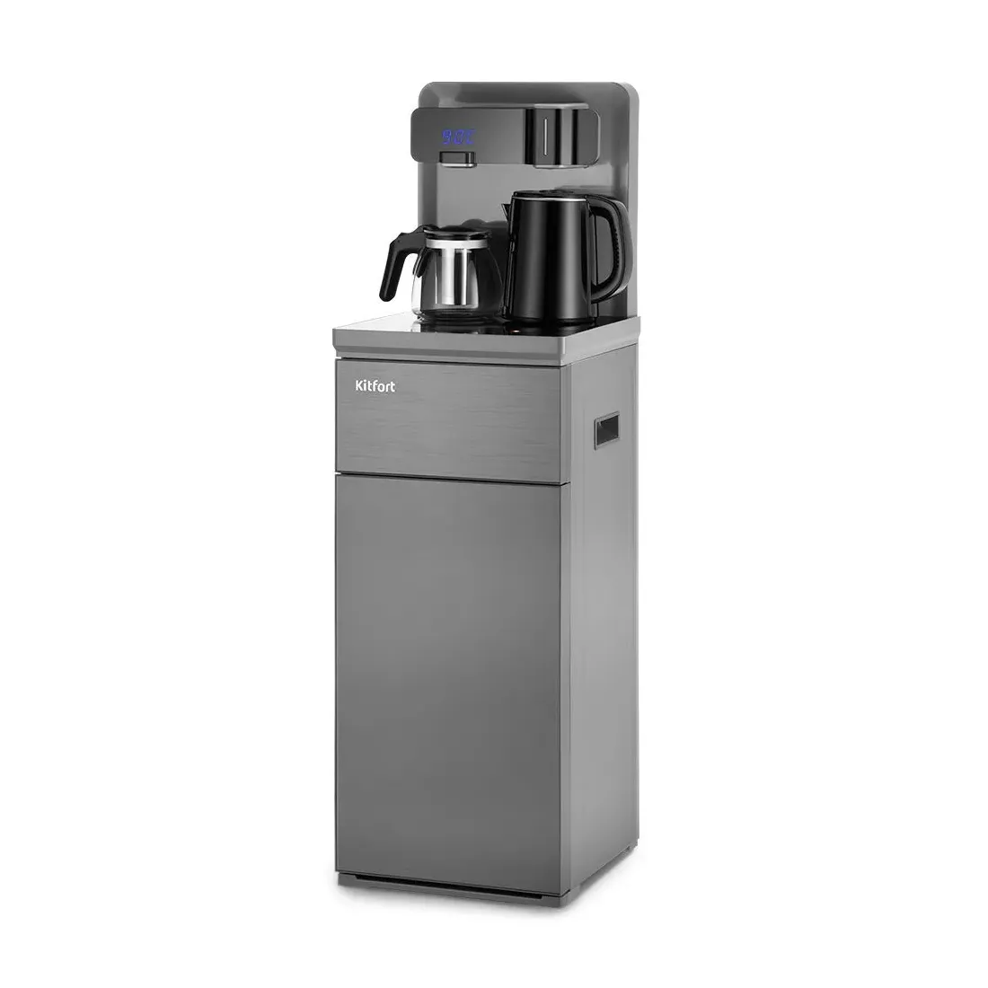 Кулер с чайным столиком КТ-6693 совмещает в себе функции электрической помпы для воды и чайного набора, состоящего из чайника и заварочного чайника с фильтром. Кулер обеспечивает закрытое хранение ёмкости для воды, а также имеет полку для хранения.