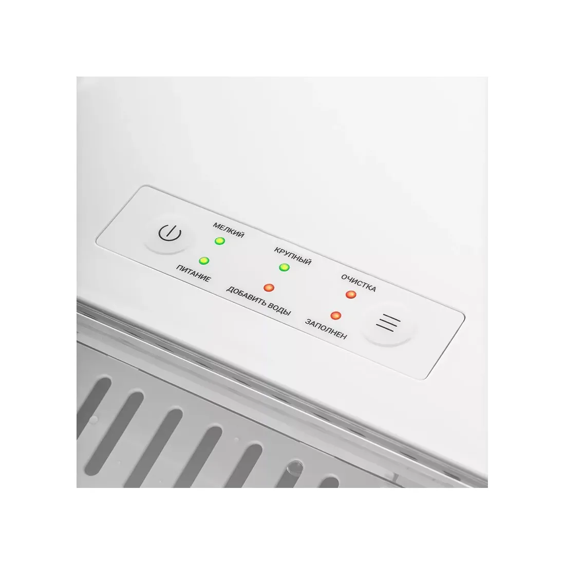 Кнопка справа позволяет выбрать мелкий или крупный размер ледяных напёрстков. Индикаторы на панели управления сигнализируют о необходимости добавления воды, о заполнении корзины, о запуске процесса автоматической очистки и о том, какой размер льда выбран.