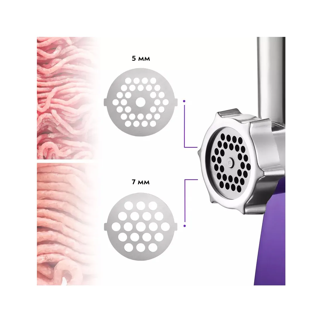 В комплект мясорубки входят 2 решётки для изготовления фарша с отверстиями 5 мм и 7 мм. Они позволят сделать как фарш для котлет и бифштекса, так и для нежнейших фрикаделек.