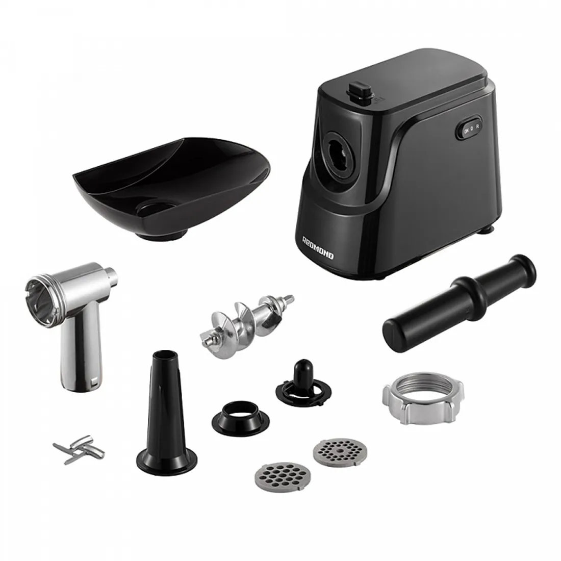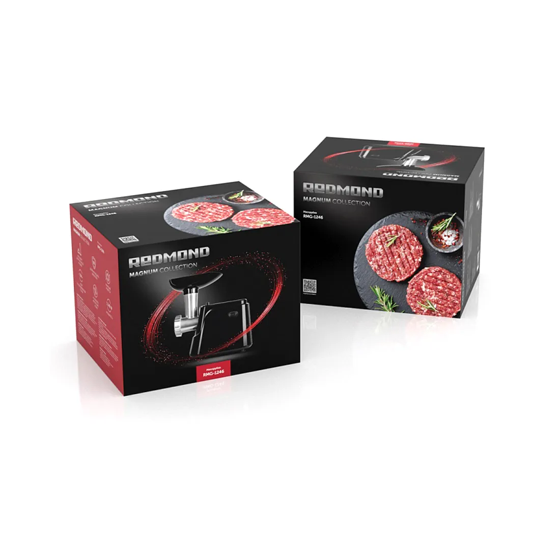 REDMOND RMG-1246 – мощная мясорубка 3 в 1 с комплектом перфорированных дисков для изготовления фарша, а также насадками для домашних колбасок и восточных кеббе с начинкой.