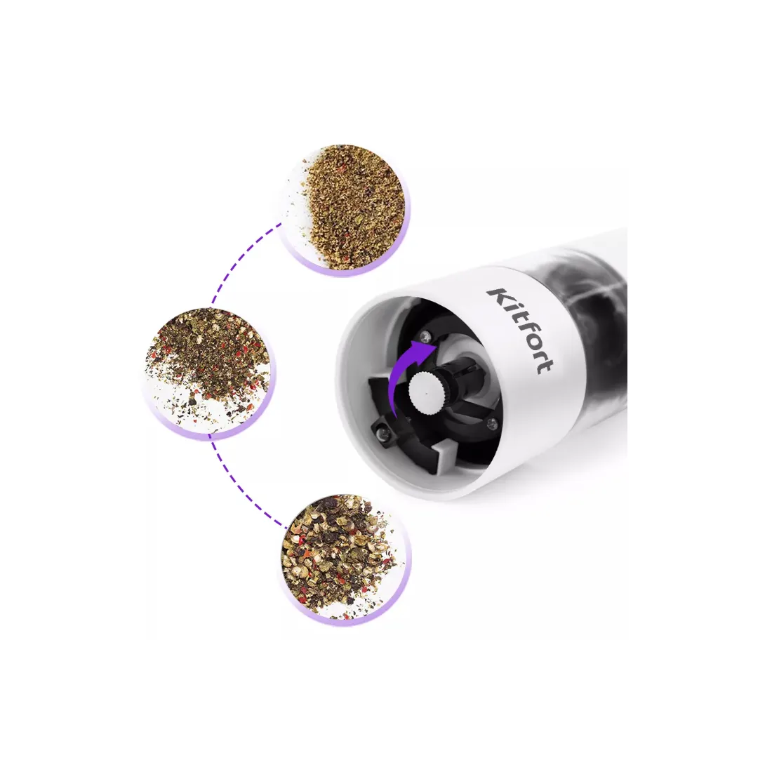 Набор мельниц Kitfort KT-2027 измельчает перец-горошек, соль и другие специи. Нет нужды молоть специи впрок. Мельница одновременно мелет и дозирует. Поместите её над блюдом и просто нажмите кнопку.