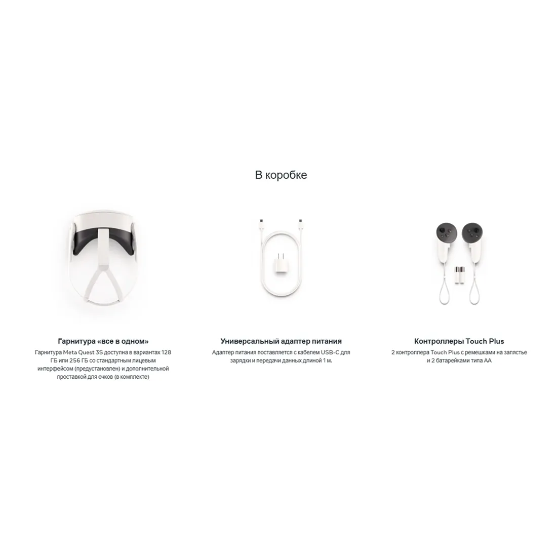 Гарнитура Meta Quest 3S доступна в вариантах 128 ГБ или 256 ГБ со стандартным лицевым интерфейсом (предустановлен) и дополнительной проставкой для очков (в комплекте)