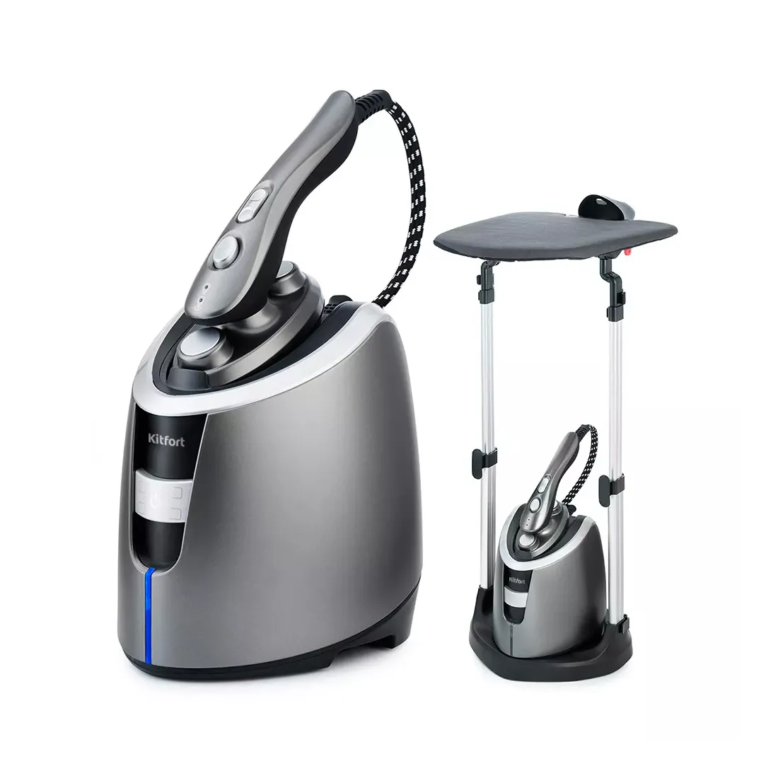Отпариватель Kitfort KT-927 принадлежит к профессиональной серии. Он имеет подогреватель пара в утюжке и может работать в двух режимах: глажка и отпаривание.