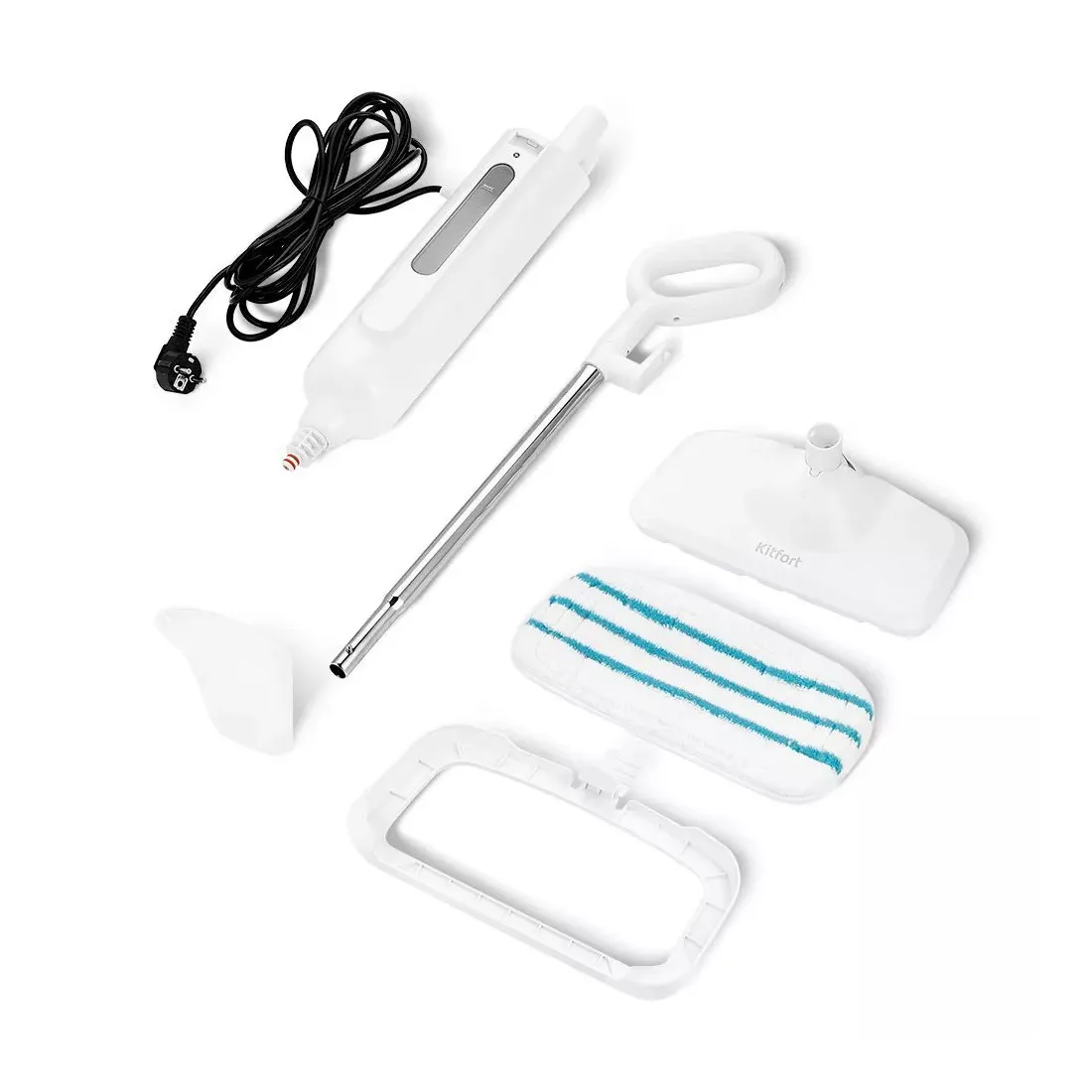 Паровая швабра, Kitfort, КТ-1052, Объем резервуара 330 мл, Подача пара 20-30 г/мин, Время нагрева 30 сек, Время работы 11-16 мин, Мощность 1300 Вт, Длина шнура 5м, Белый/Синий