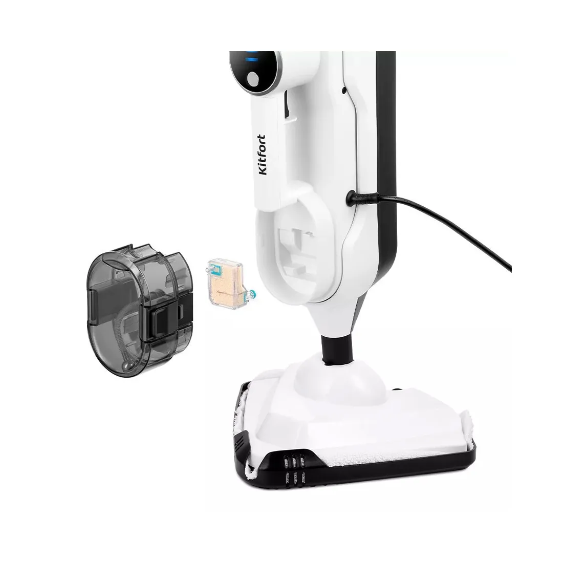 Конструкция КТ-1072 предусматривает наличие ручного пароочистителя. Он встроен в вертикальный модуль и быстросъёмный. Благодаря этому одно устройство заменит дезинфектор, стеклоочиститель и отпариватель. Это идеальный помощник уборки всех помещений.