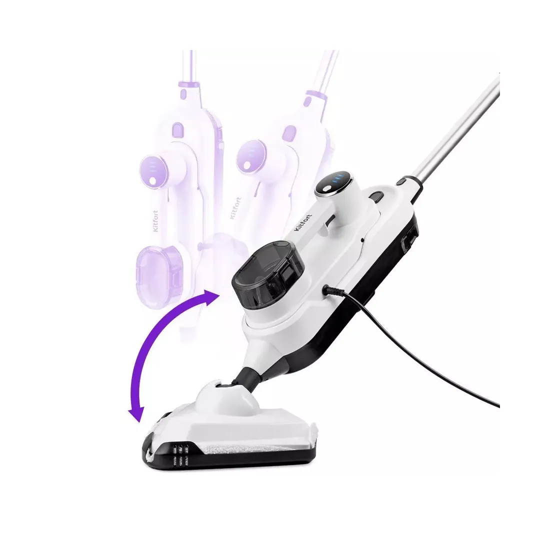Стильная паровая швабра с функцией вертикальной парковки «2 в 1» КТ-1072 — универсальное и современное устройство, которое поможет избавиться от пыли и грязи с помощью мощной струи пара, а также продезинфицирует обрабатываемую поверхность.
