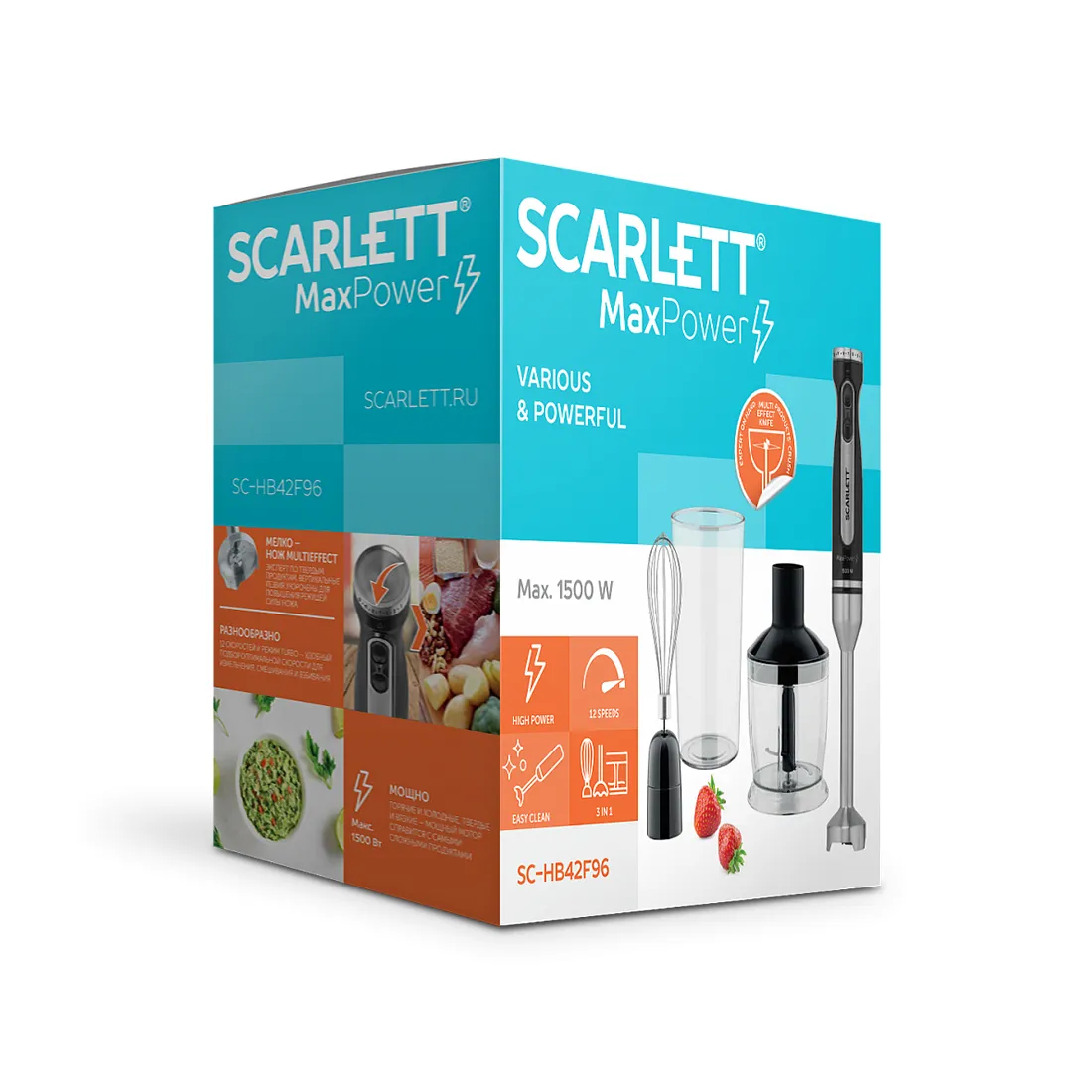 Погружной блендер, Scarlett, SC-HB42F96, Мощность 1500 Вт, 12 скоростных режимов, Емкость измельчителя 0.6 л, Мерный стакан 0.6 л, Венчик, Черный