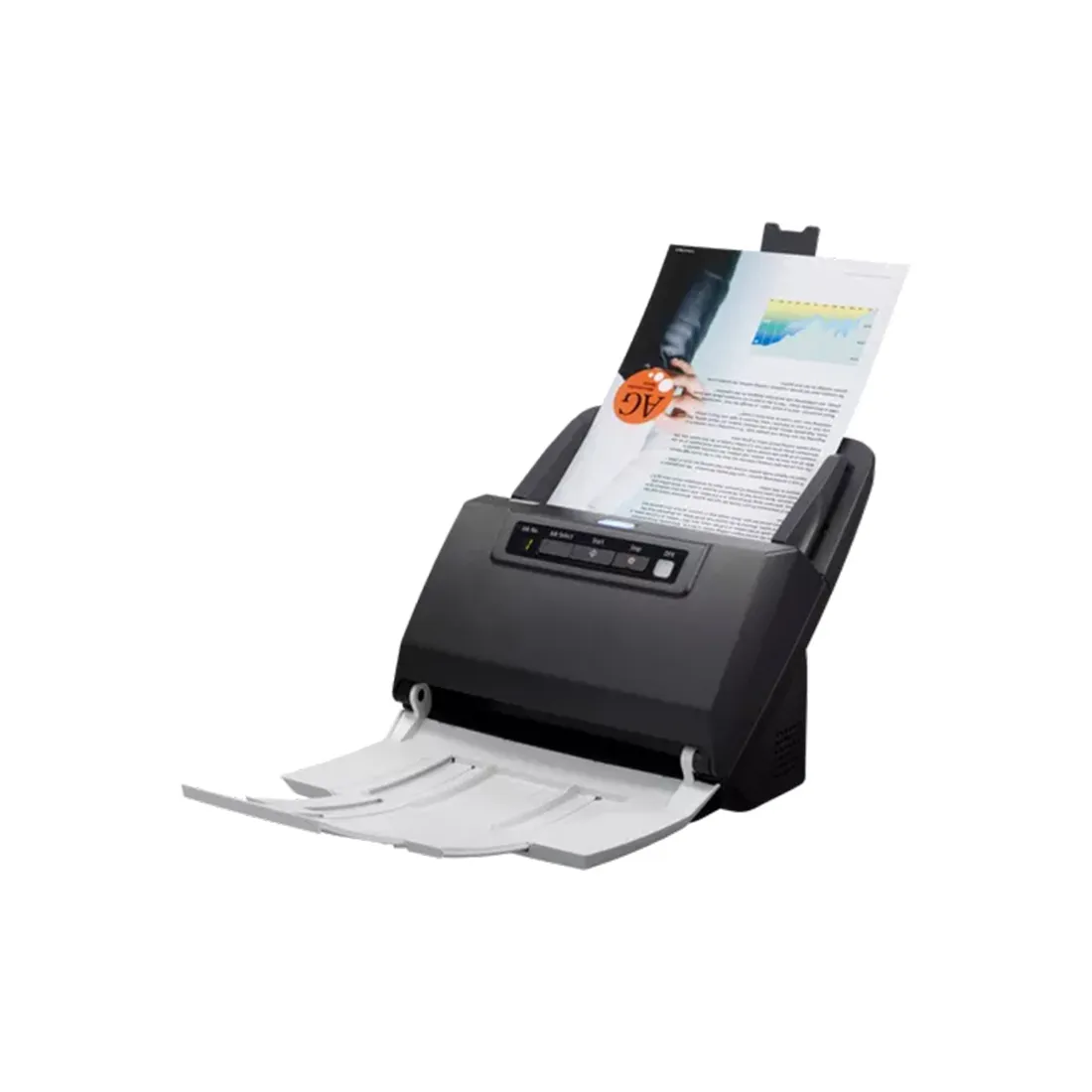 Прочная конструкция для интенсивной работы. Конструкция сканера включает в себя впечатляющее устройство подачи документов на 75 листов с функцией обработки пачек смешанных документов для увеличения производительности.