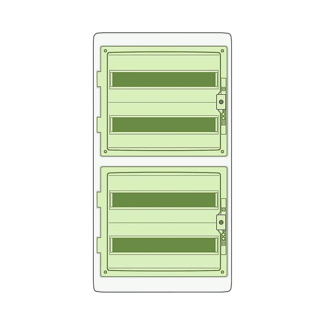 Этот защищенный от атмосферных воздействий щит Kaedra представляет собой щит для модульного устройства, устанавливаемый на поверхности. Состоит из 4 рядов по 18 модулей по 18 мм. Может применяться ко всем типам модульных распределительных устройств. Степень защиты IP — 65. Этот щит предназначен для водонепроницаемой установки внутри или снаружи помещений. Он оснащен прозрачной зеленой дверью. Цвет корпуса — светло-серый (RAL 7035). Он предназначен для установки в жилых домах, небольших зданиях и на промышленных объектах. Кабели могут быть введены сверху или снизу шкафа.