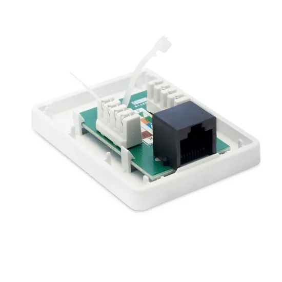 Для внешнего монтажа. Корпус настенной розетки состоит из основания и крышки. Конструкция выполнена из высококачественного пластика. Внутри расположен модуль RJ-45, UTP, стандарта категории 5e. Крепёжные элементы для монтажа включены в комплект. Корпус крепится к поверхности при помощи двух винтов и шурупов.