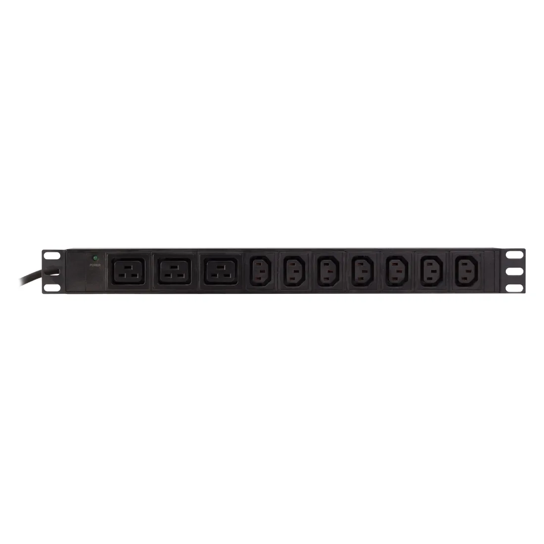 Блок розеток для 19″-дюймовых конструктивов, выполнен в корпусе из высокопрочного пластика. Розетки расположены горизонтально, на лицевой части блока установлен выключатель.