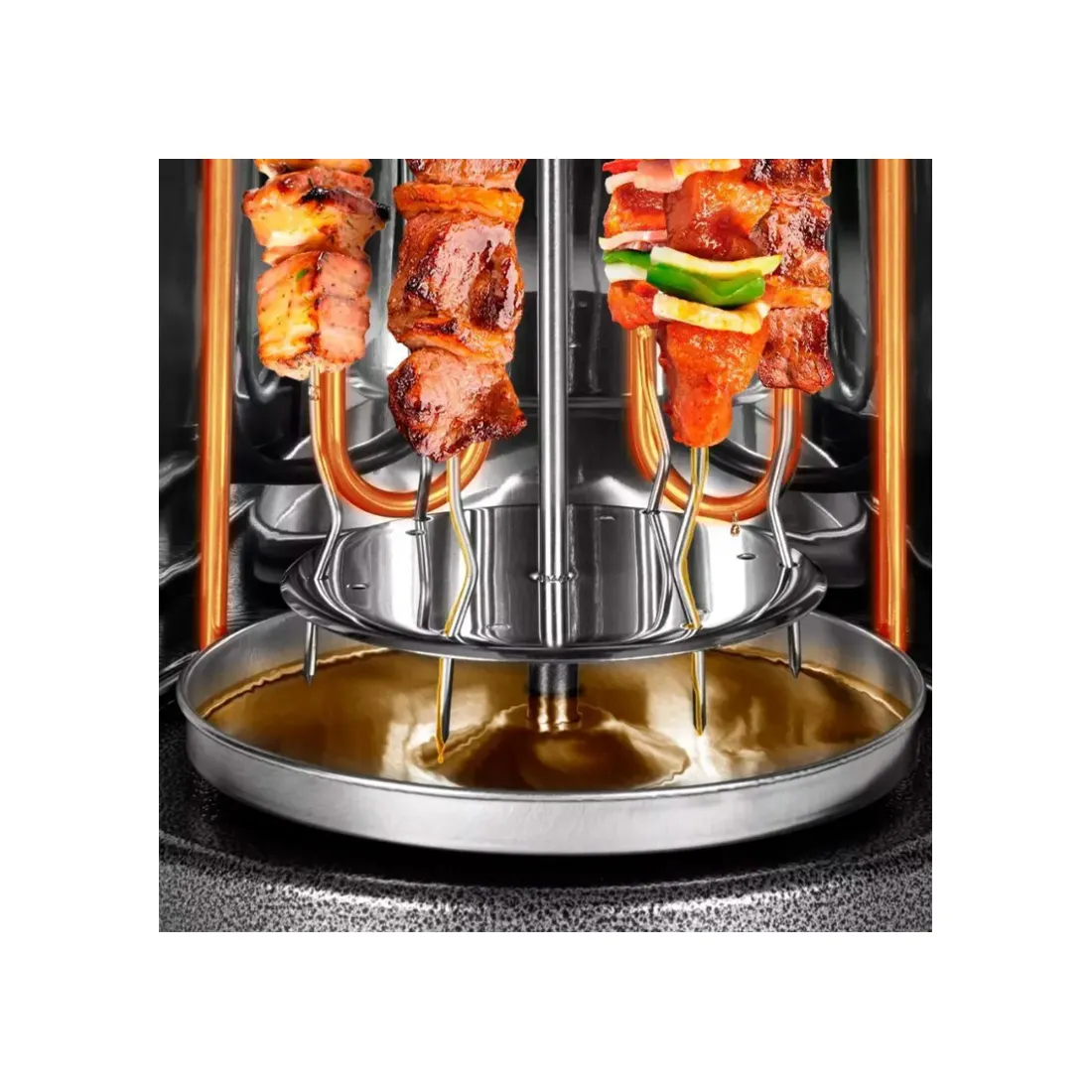 Инфракрасный нагревательный элемент обеспечивает такой же нагрев, какой дают угли в обычном мангале, а автоматическое вращение шампуров позволяет мясу оставаться сочным внутри и равномерно обжаренным снаружи!