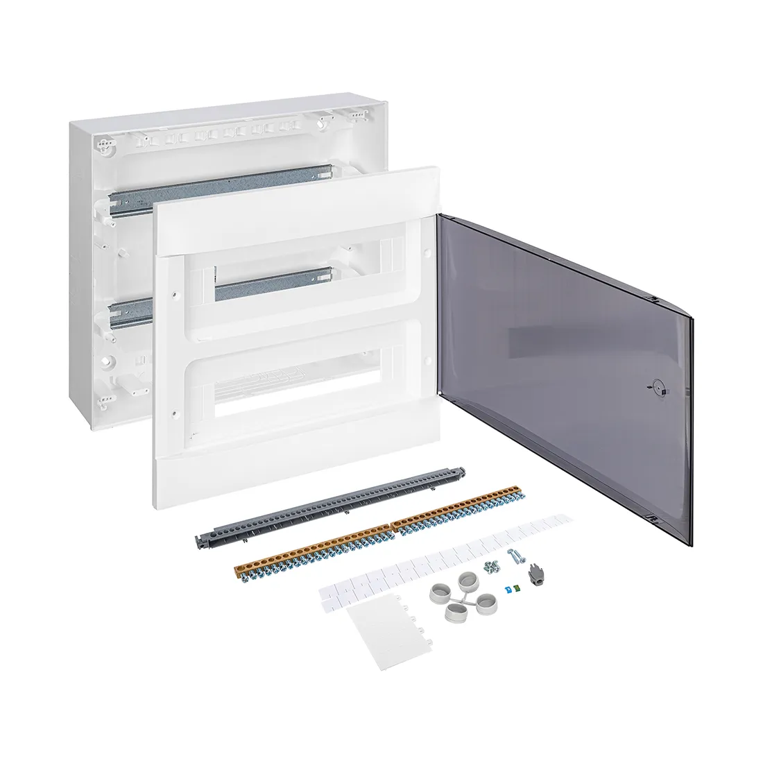 Простая установка реек. Позволяет выполнить предварительный электромонтаж вне щитка. Упрощенная установка реек без винтов и инструментов.
