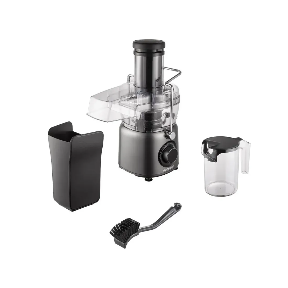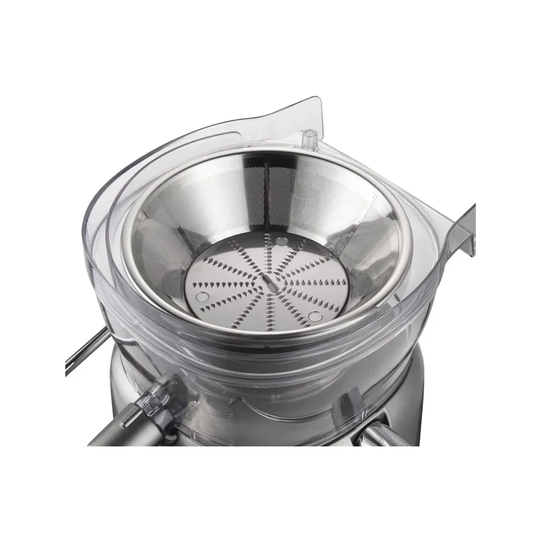 Мощностью 1040 Вт оборудована широкой горловиной диаметром 84 мм, что исключает необходимость нарезать ингредиенты мелкими кусками. Выполненная из нержавеющей стали сетка не воздействует на вкусовые свойства сока. Скорость вращения двигателя достигает 16000 об/мин.