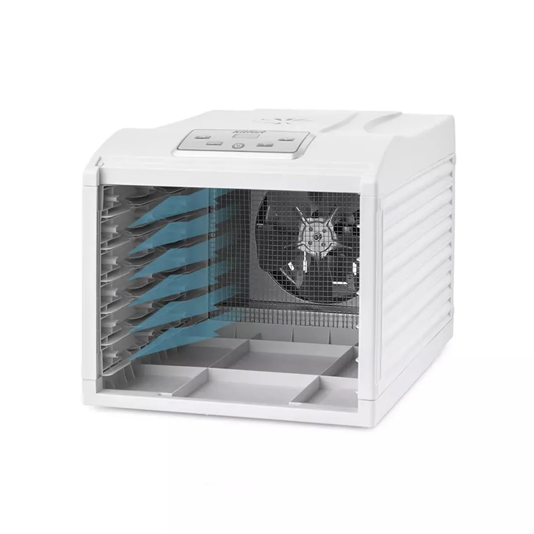 Сушилка оборудована большим мощным вентилятором, что обеспечивает равномерный горизонтальный обдув всех 6 поддонов. Поток воздуха направлен горизонтально, поэтому запахи продуктов с разных поддонов не смешиваются.