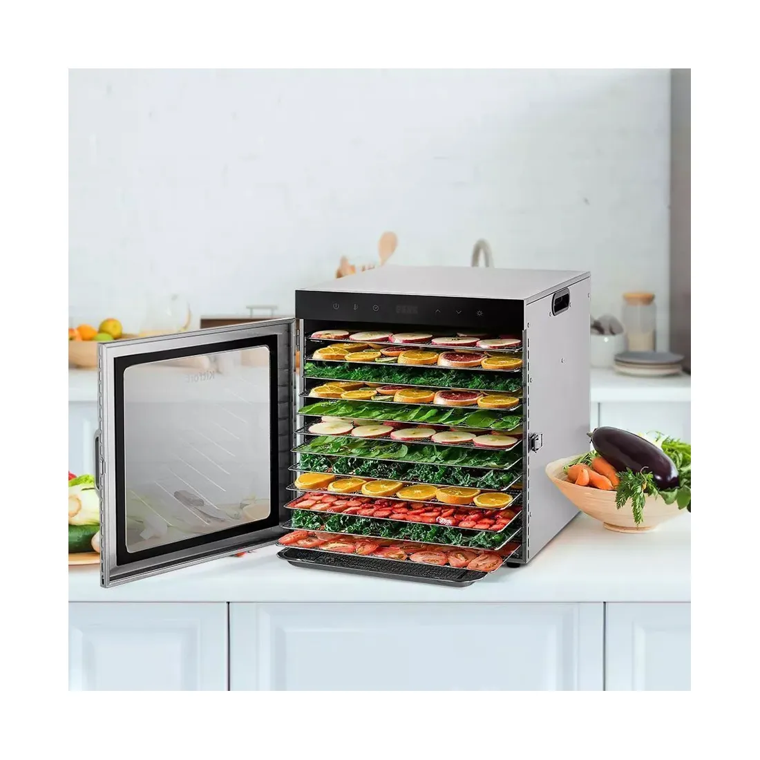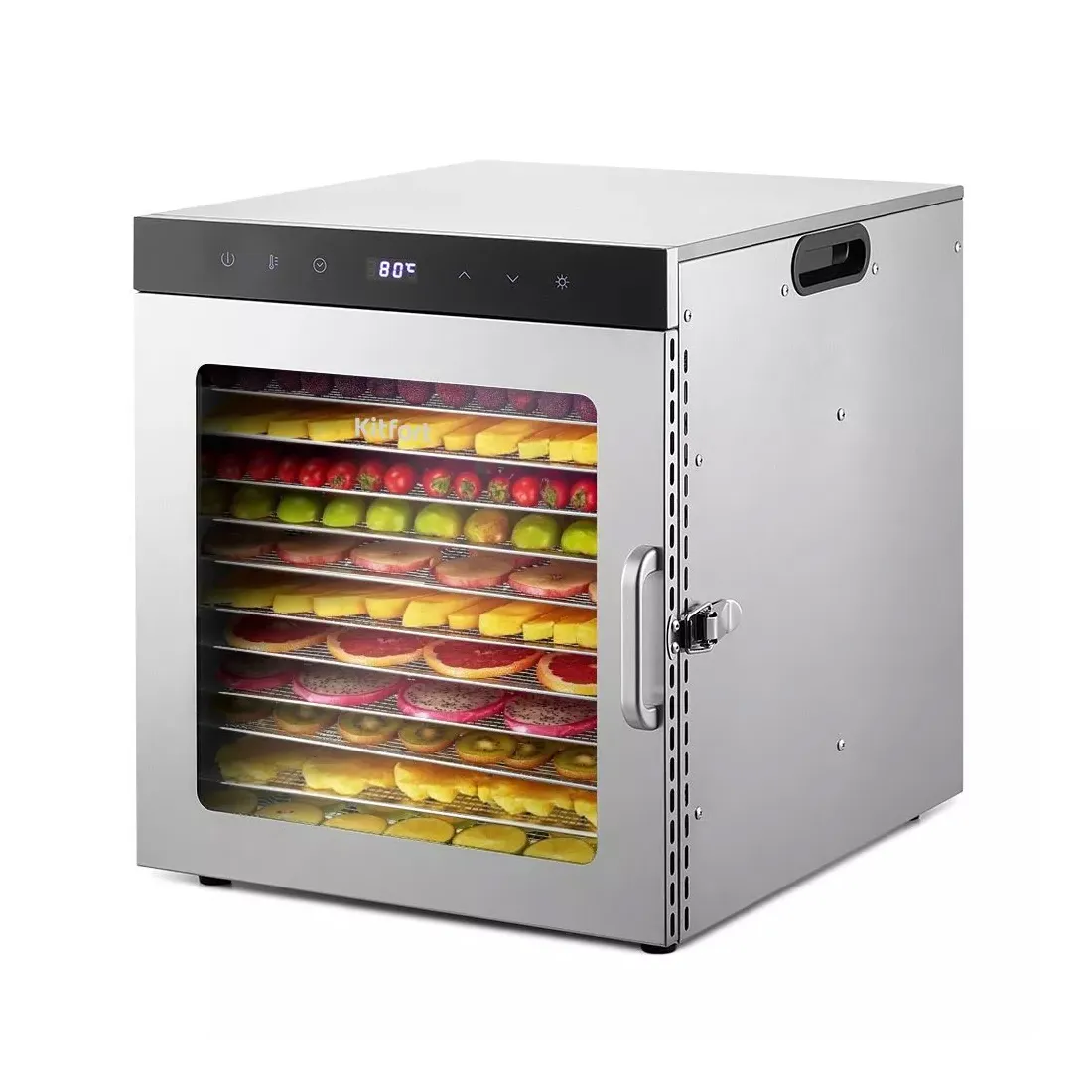 Вместительная сушилка для овощей и фруктов КТ-1951 на 12 поддонов и с прозрачной дверцей сохранит любимые фрукты и овощи полезными круглый год! Она насушит на всю зиму мясо, рыбу, помидоры, клубнику, персики, грибы, зелень, хлеб.