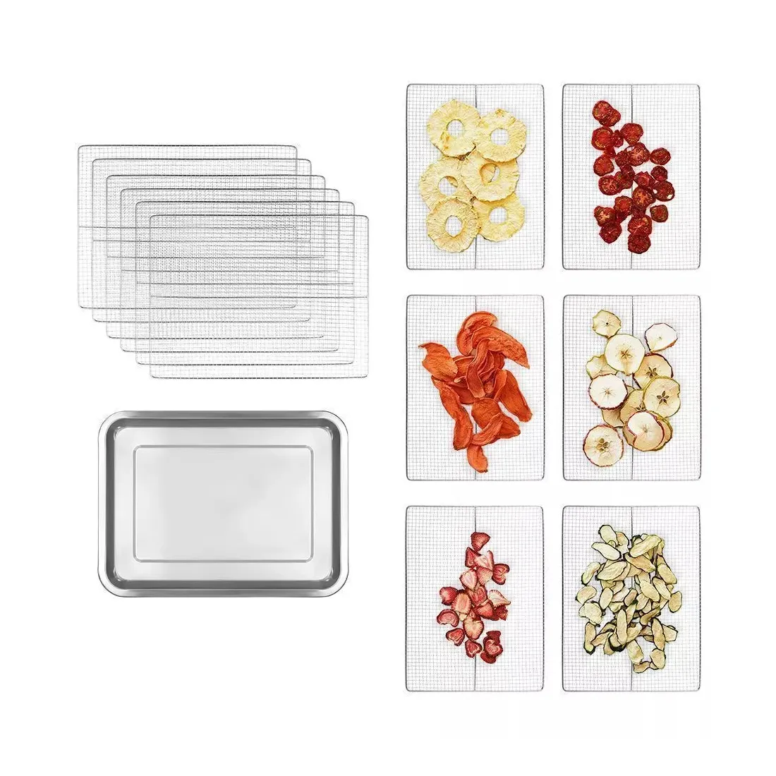 В комплекте к сушилке идут 12 вместительных металлических поддонов размерами 28,5 х 38 см. На них, помимо овощей, фруктов, ягод, грибов и зелени, можно сушить мясо, рыбу и птицу. Продукты разного типа рекомендуется выкладывать на разные поддоны.