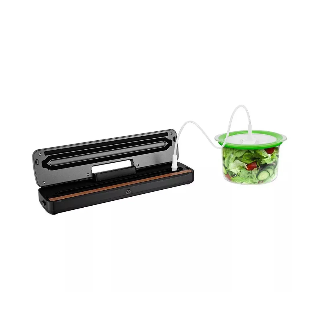 У устройства можно активировать режим откачки воздуха из контейнеров. Вакуумирование происходит при помощи шланга, вставленного в фитинг вакууматора одним концом, а другим в фитинг крышки контейнера.