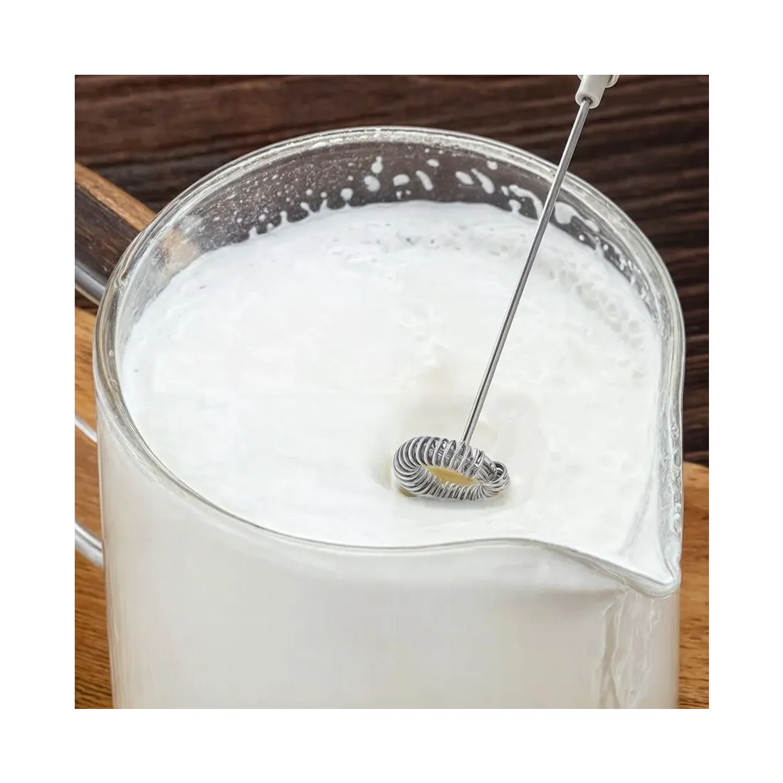 Благодаря венчику из нержавеющей стали можно взбивать горячее молоко, какао и другие напитки. Пружина достаточно жёсткая, что обеспечивает быстрое получение упругой пышной пенки.