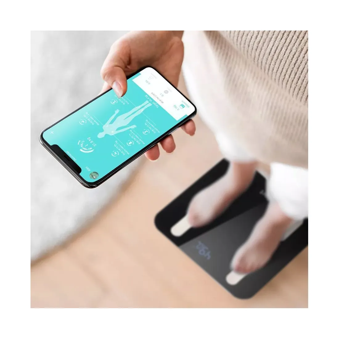 На платформе встроены металлические пластины, встав на которые, проводится диагностика тела. Далее весы синхронизируются по Bluetooth с приложением «Fitdays», где будут отражены показатели вашего тела. Вся информация будет храниться у вас в телефоне.