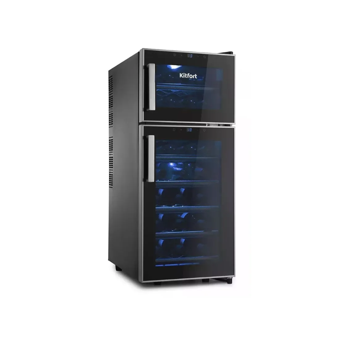 Важной особенностью винного шкафа Kitfort КТ-2406 является наличие двух климатических зон, в которых можно хранить разные сорта вина при разной температуре.